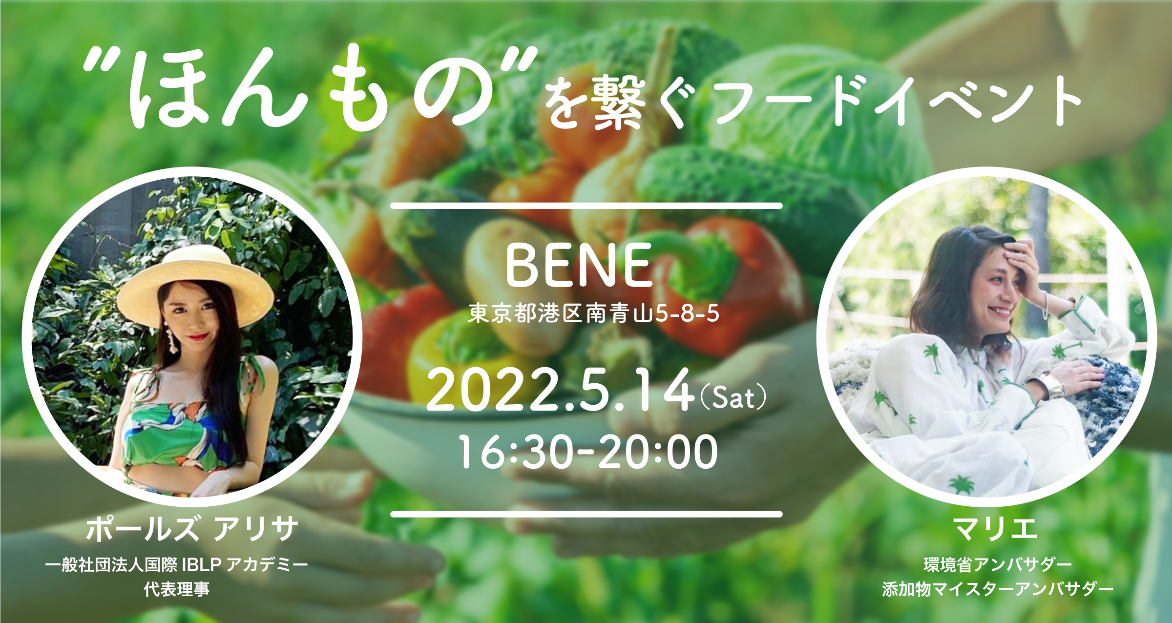 一般社団法人国際IBLPアカデミー(代表 : ポールズ亜梨沙、本社 : 東京都港区麻布十番2-5-12麻布ビルディング3F)は、全国の生産者が愛情とこだわりを持って作った”ほんもの”の食を五感で楽しむフードイベントを、2022年5月14日に「BENE-」で開催いたします。
