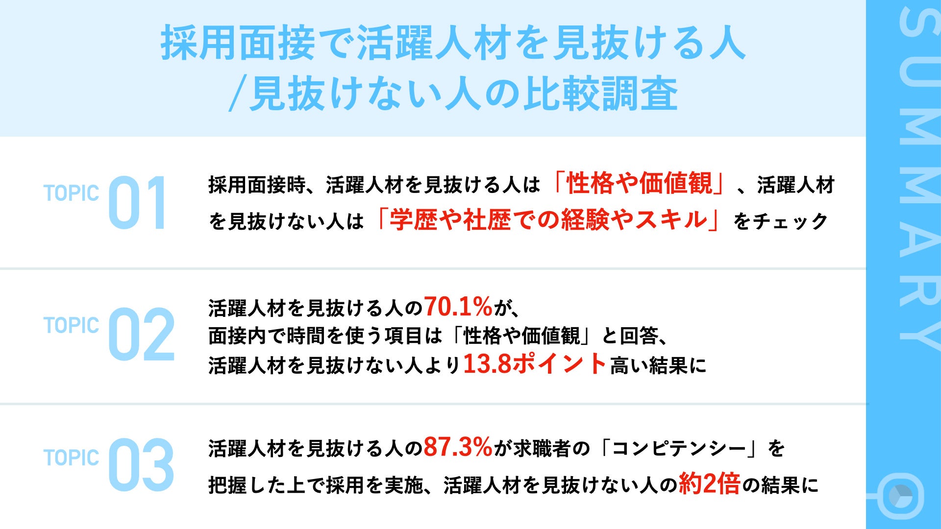 - 活躍人材を見抜ける人の70.1%が、面接内で時間を使う項目は「性格や価値観」と回答、活躍人材を見抜けない人より13.8ポイント高い結果に
