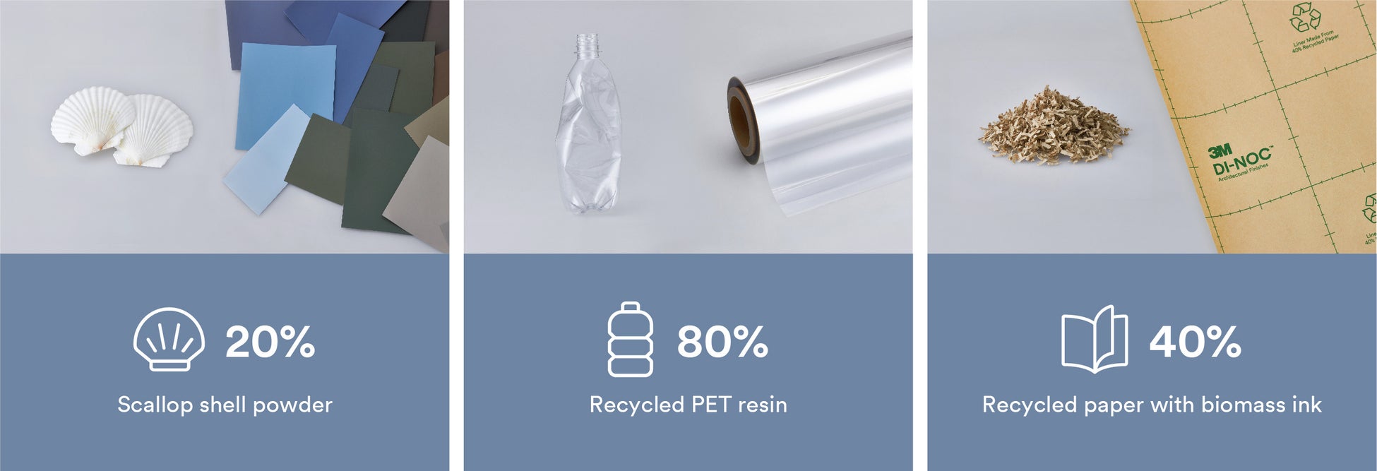 3M™ ダイノック™ フィルム Ecoシリーズ RC “リサイクルコンテンツフィルム” は、ホタテ貝殻由来のバイオベース材料とペットボトル由来のリサイクルPET樹脂から作られた、美しいアースカラーのコレクションです。