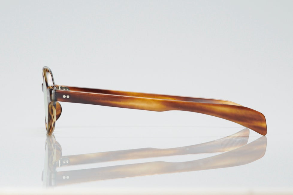 通常使われるアセテート素材のメガネでは、金属の芯をテンプルに刺して強度を出します。しかしセルロイドは固いため、芯を使わず十分な強度を出すことが可能です。金属の芯を補強に使わない“ノー芯”製法は、セルロイド本来の美しさを金属の邪魔なく堪能できるのが魅力。特に濃淡のある色味のセルロイドはテンプルの部分が透けて見えるのが美しいです。佐々木セルロイドの社内デザイナーが綿密に設計し、職人が手で丁寧に加工することで芯を使わずとも強度を出すことを実現しました。