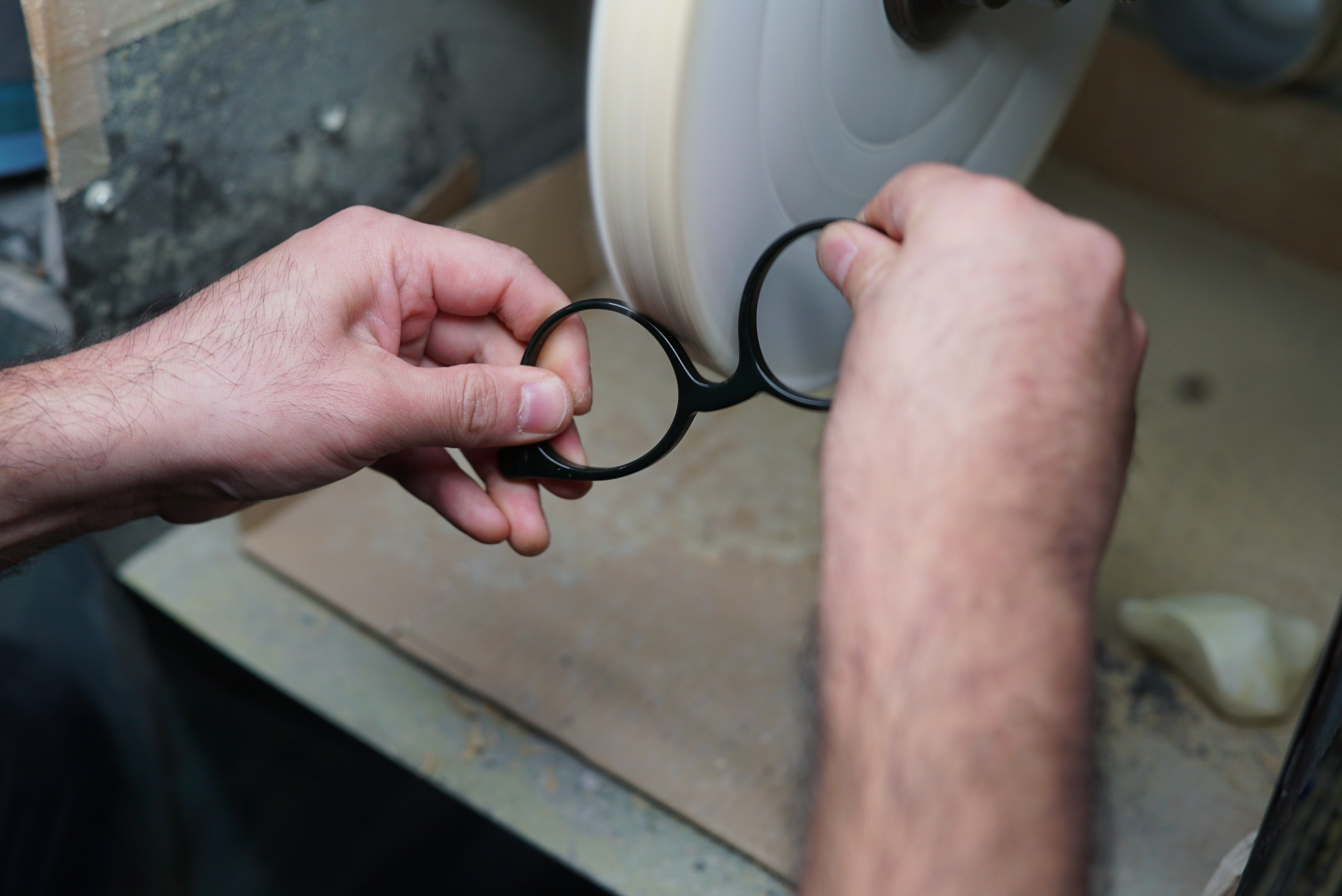 メガネの製造工程の中で、最も熟練の技が必要な「磨き」。佐々木セルロイド工業所では、この工程に多くの職人が従事し、日々手塩にかけて、メガネを艶やかに磨きあげています。創業以来100年余り、セルロイドメガネの「磨き技」を研究し続け、時間をかけて独特の技術を体得してきました。おかげさまで、今では世界中の著名なブランドから、メガネ・サングラスの製作の依頼をいただいております。「SASAKI」に使われるセルロイドは素材が固く、滑らか・艶やかに仕上げるためにアセテートの約130%の時間をかけて磨く必要があり、「SASAKI」
