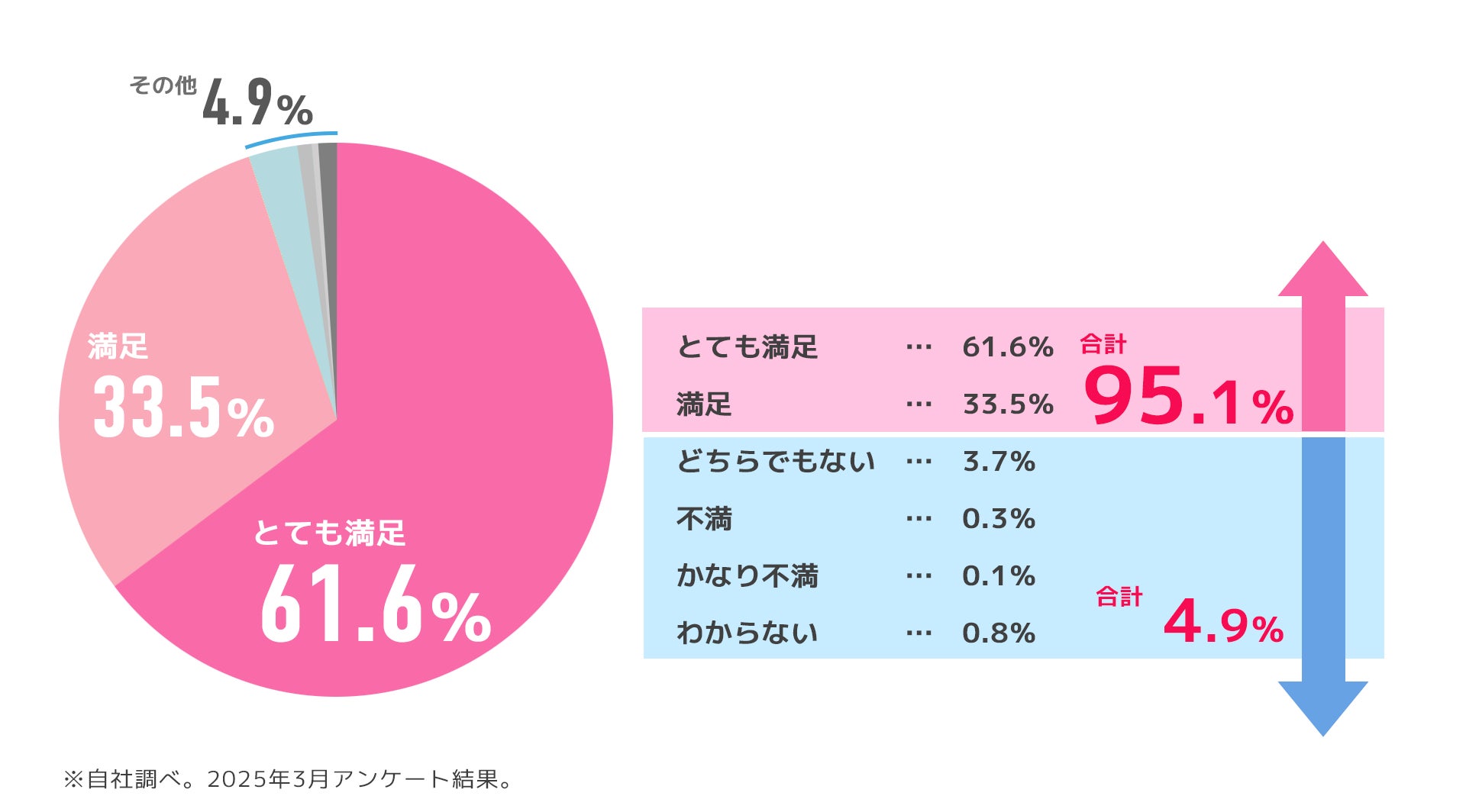 3月分のアンケートでは、「とても満足:61.6%」「満足:33.5%」「その他:4.9%」と高い評価をいただきました。