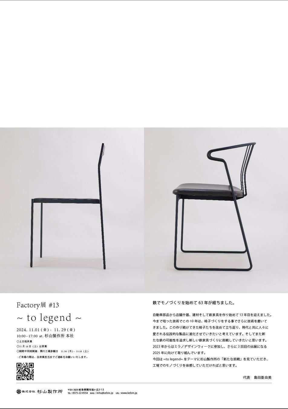 日本のクラフトマンシップを受け継ぐミニマルな「鉄家具」ブランドのメーカー、杉山製作所が自社ショールームで「Factory展#13 ~to legend~」を開催。新作発表やプロトタイプの展示など。