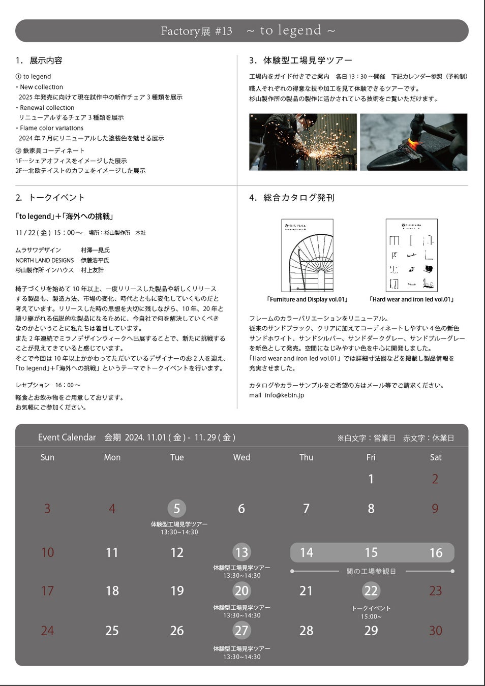 13回目となる杉山製作所の「FACTORY展」を、11月1日~29日まで開催します。今の製品をさらに皆様に愛される伝説的な製品にしていきたいと思い「~to legend~」というテーマを掲げました。