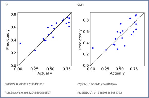 目標性能に対する新規材料の作製条件を予測する場合、通常実験していないダミーの作製条件のサンプルを乱数などで大量に生成したものを別に用意する必要があります。そして、それらの作製条件全てに対し機械学習モデルを当てはめて予測し、予測結果の中から良好なものを選ぶというプロセスを経ます。一方本機能では、混合ガウス回帰(GMR)と呼ばれる機械学習モデルを用いてダミーサンプルを用意する必要なく、設定目標に対してそれを達成する確率の高い作製条件を直接予測してくれます。