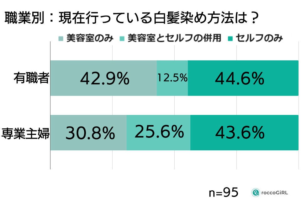 - 専業主婦と比較すると有職者の方が美容室のみで白髪を染めている人の割合が約12%多いという結果に