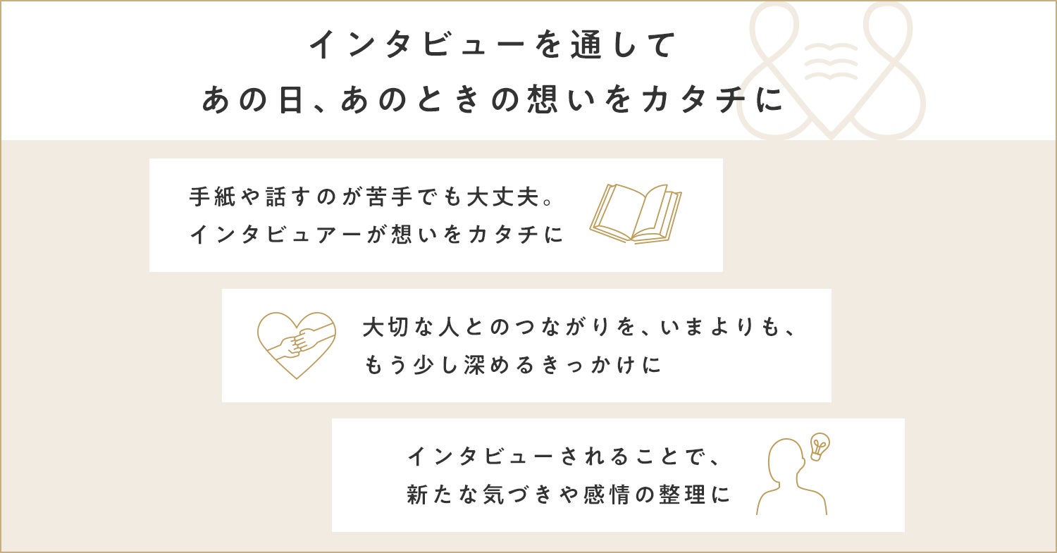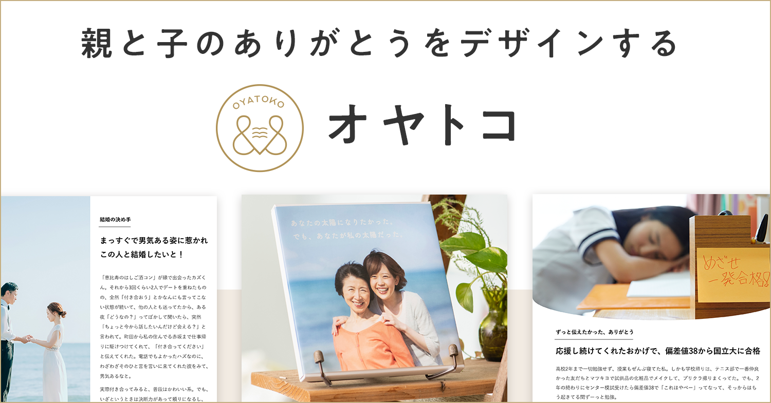 お一人でのインタビューはもちろん、親子そろってのインタビュー、ご夫婦そろってのインタビューなども対応しているため、お互いの想いを双方向で伝えあうこともできます。また、カメラマンによる写真撮影や動画撮影のオプションもご用意。「思い出の場所で大切な人と写真を撮ってオヤトコに載せたい」、「動画としても残したい」といった、お客さま一人ひとりのご要望に寄り添ったサービスを提供しています。