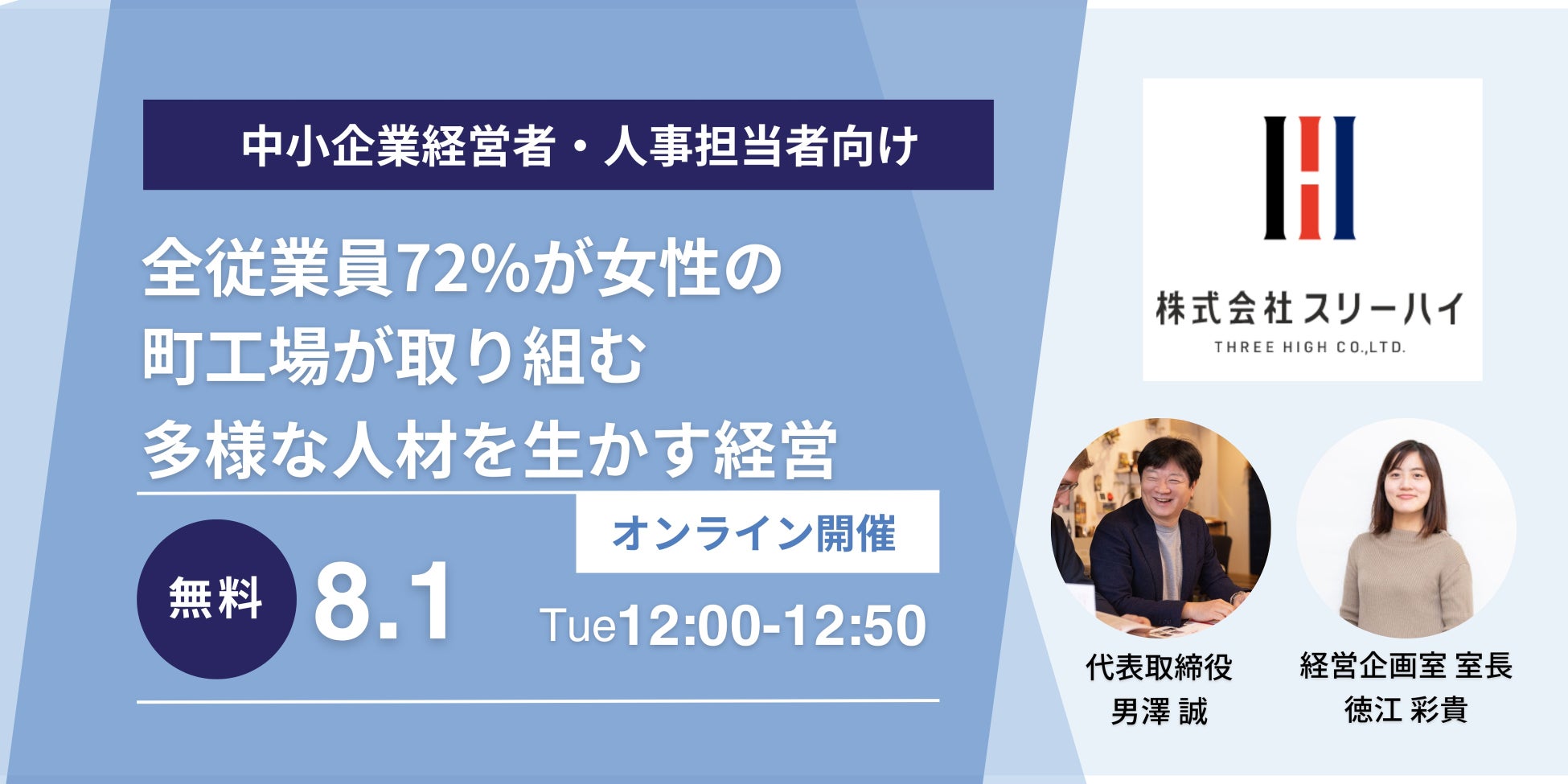 本セミナーでは、当社代表の男澤と経営企画室⻑の徳江のパネルディスカッションから、⼦育て世代を中⼼としたスリーハイの多様な社員を⽣かす取り組み、取り組むにあたってぶつかった壁、それをどのように乗り越えているか等、町⼯場の等⾝⼤の姿をお話いたします。