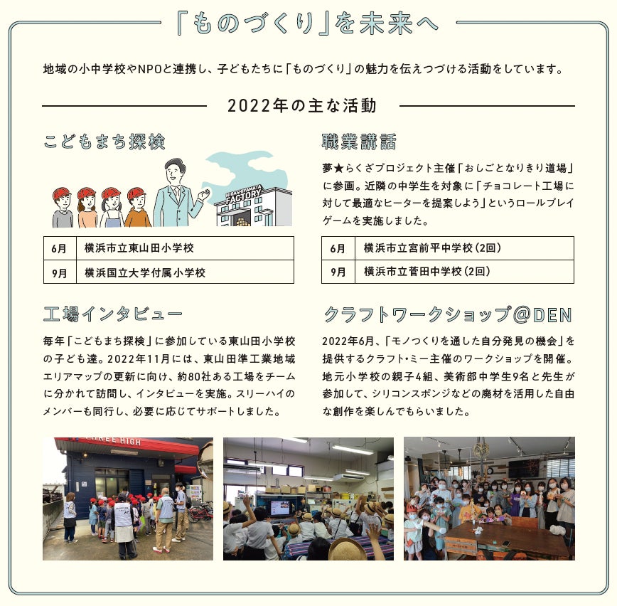 具体的には、スリーハイが立地する東山田地区の工場を紹介する「こどもまち探検」や「工場インタビュー」などです。これら地域活動の取り組みには、スリーハイの従業員が主体となって取り組んでいます。