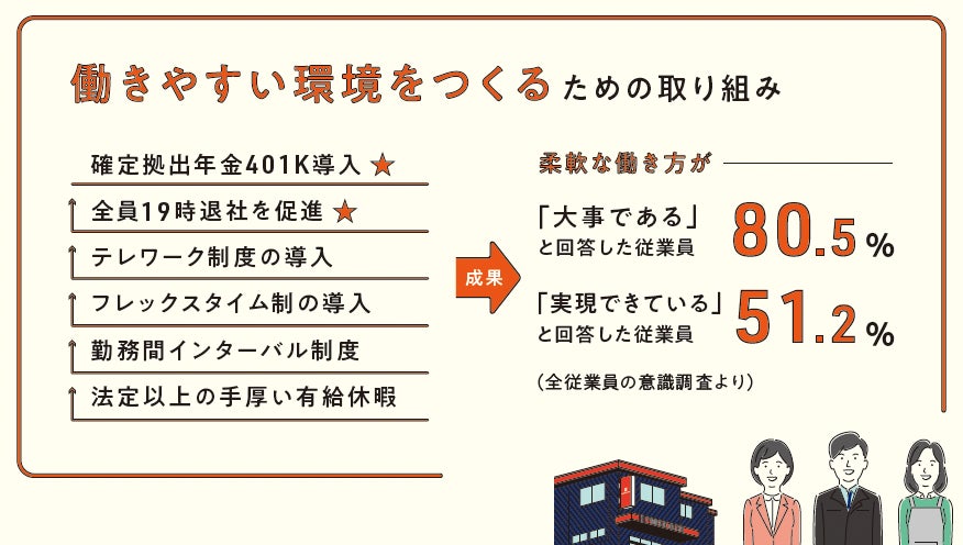 スリーハイは労働集約型である製造業ですが、一部の職種ではテレワーク制度やフレックスタイム制を導入しています。それにより、柔軟な働き方が実現できていると回答した従業員は51.2%という結果がでました。