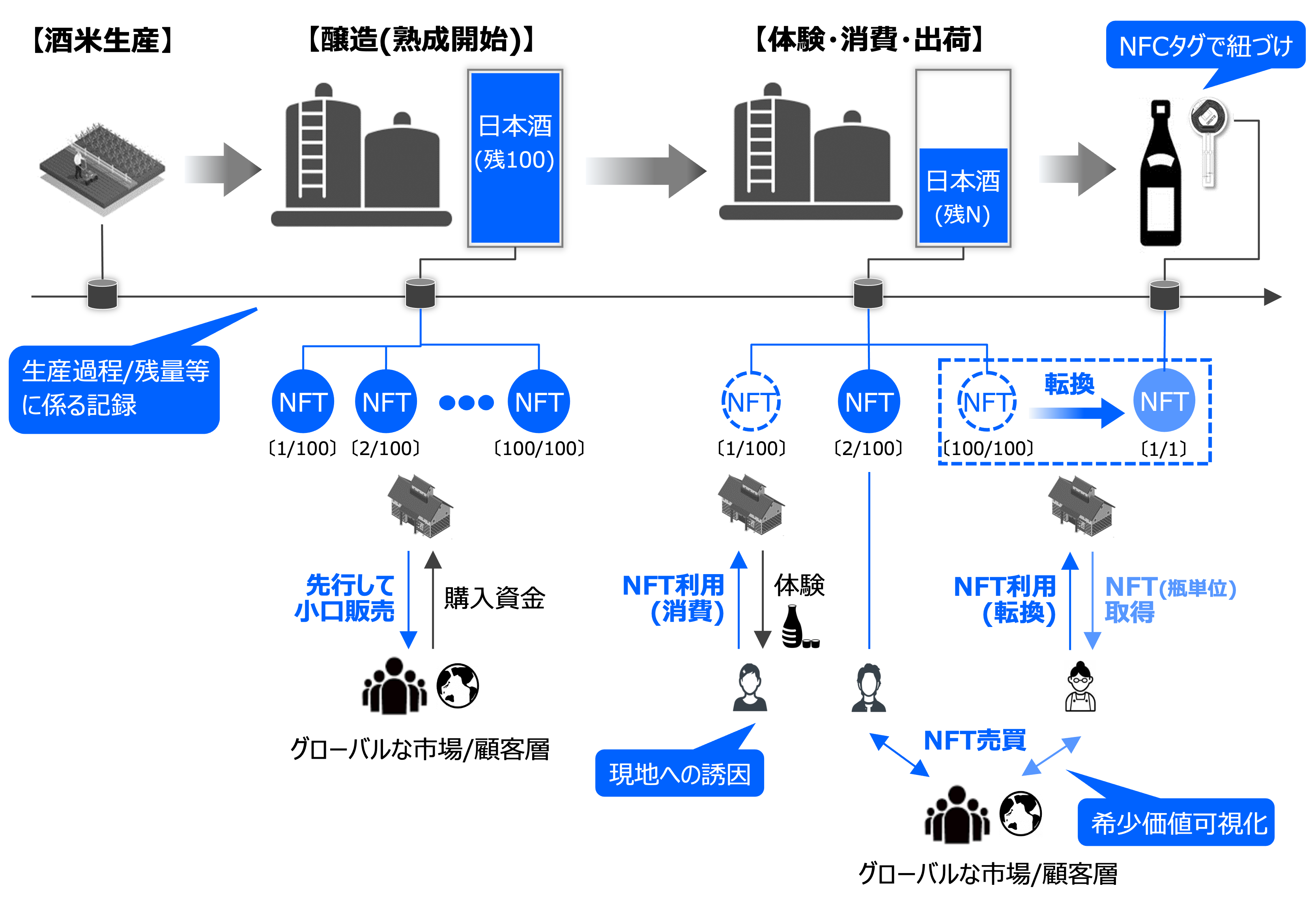 「資金繰り」や「新たな体験価値」に対しては、「トレーサブルNFT」の仕組みを日本酒に適用した「日本酒トークン」により、リアルアセットやトレーサビリティ情報を紐づけた日本酒(醸造・熟成段階)に関する権利(将来債権等)をNFTとして先行/小口販売することで、古酒や熟成酒へ挑戦する酒造会社の前広な資金調達を可能にすると共に、幅広い消費者を対象としたブランドエクスペリエンスの提供を可能とします。当該NFT保有者は、当該権利を熟成期間中にNFTとして第三者へ譲渡し資金化することや、権利を行使して調合・出荷した個々の「日本酒」(瓶)を紐づけたNFTに転換し、直接利用(飲酒)又は第三者への譲渡が可能となります。これらの「日本酒トークン」の権利移転はブロックチェーン上で完結するため、グローバルな取引も容易になります。