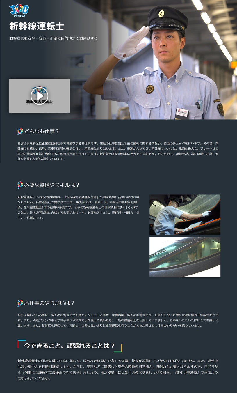 ジョブレンズとは、地域を支える様々な職業を映像化した、キャリア教育のWEB教材プラットフォームです。サイト内では100種類以上の職業を紹介しており、現在47職種を動画化しています。