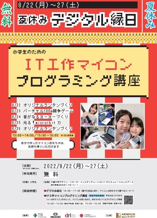 認定NPO法人キッズドア(以下:キッズドア)は、日本のITリーディング企業であるTIS株式会社(以下:TIS)、Micro:bit Educational Foundation(以下:Micro:bit 教育財団)、千葉大学デザイン・リサーチ・インスティテュート(以下:dri)の協賛により、夏休みにコンピュータの楽しさを体験する「夏休みデジタル縁日」を開催します。