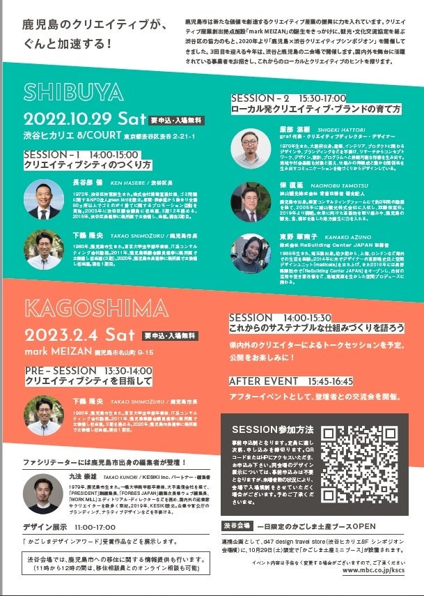 鹿児島市では、鹿児島市のクリエイティブ産業振興に係る取り組み等を全国へ情報発信するため、観光・文化交流協定を締結している渋谷区の協力を得て、渋谷区と鹿児島市でイベントを開催します。令和4年10月29日(土)に、渋谷ヒカリエ(東京都渋谷区渋谷2-21-1)で、鹿児島市長と渋谷区長によるトークセッションを行うほか、国内外で活躍する方々によるトークセッションを行います。また、「かごしまデザインアワード」の受賞作品や鹿児島市内で活動するクリエイターの作品などを展示します。