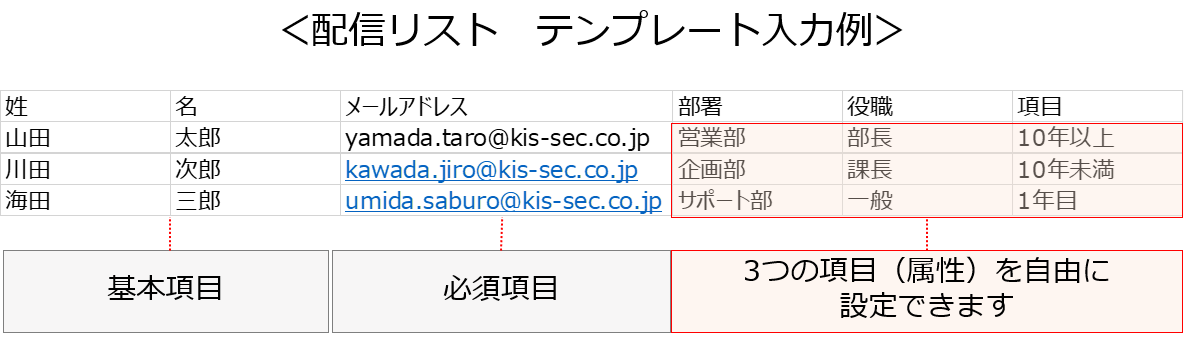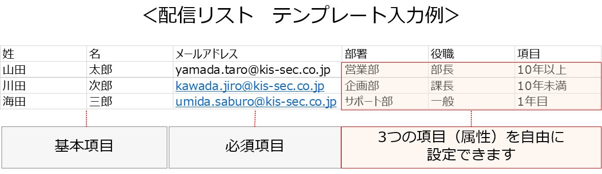 訓練対象者の項目(属性)を追加した配信リストテンプレートを提供します。配信リストテンプレートを用いることにより一括で登録することができます。予め分析したい項目を事前に登録することができます。