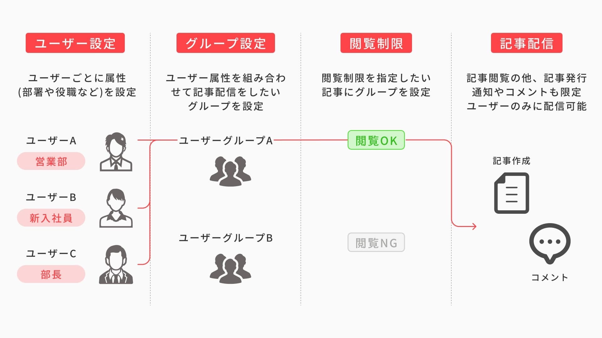 今回、公開範囲カスタマイズ機能が追加されたことにより、社内報の記事に合わせて公開範囲を詳細にカスタマイズできるようになりました。「部署」「社内・社外」「役職」など公開範囲を自由に絞って社内報を公開できるため、必要な人に必要な情報だけを届けることが可能です。