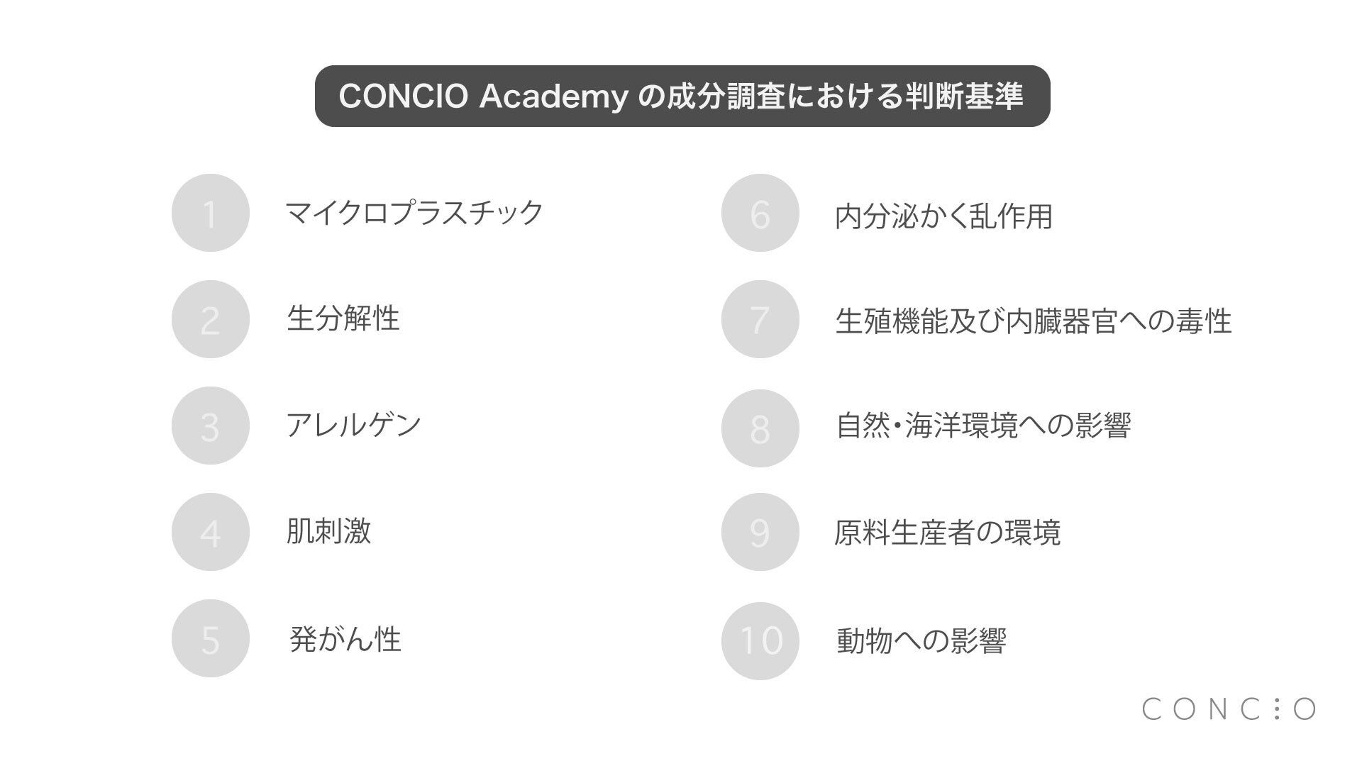 自分たちが使う化粧品が環境や健康に与える影響を考えている人に、納得できる選択肢を提供したいという思いから、CONCIO独自の成分判定基準を作成。
