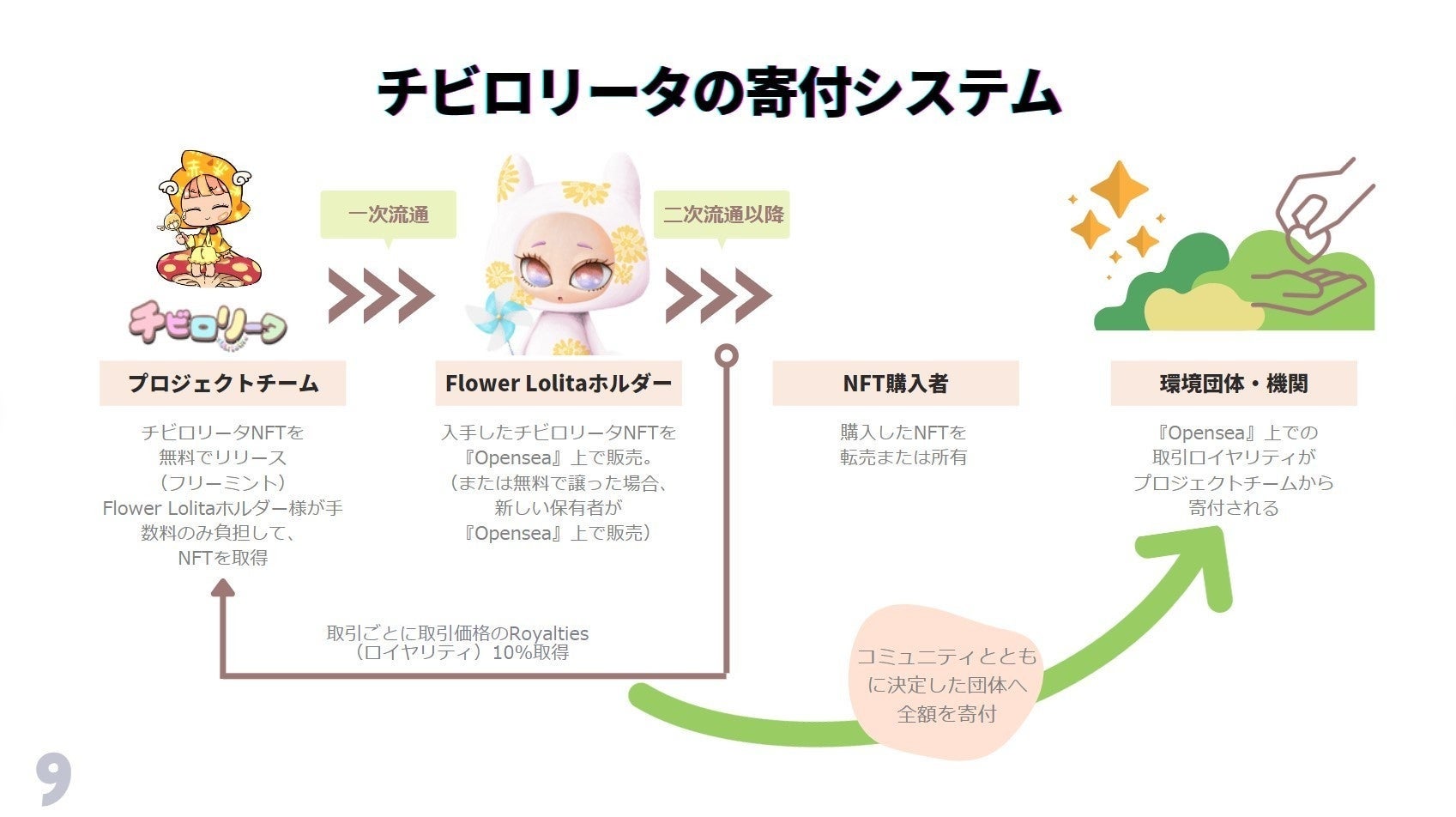 NFTプロジェクト「チビロリータ」と「FlowerLolita」の売り上げを自然や環境保護、社会貢献を目的として寄付する。