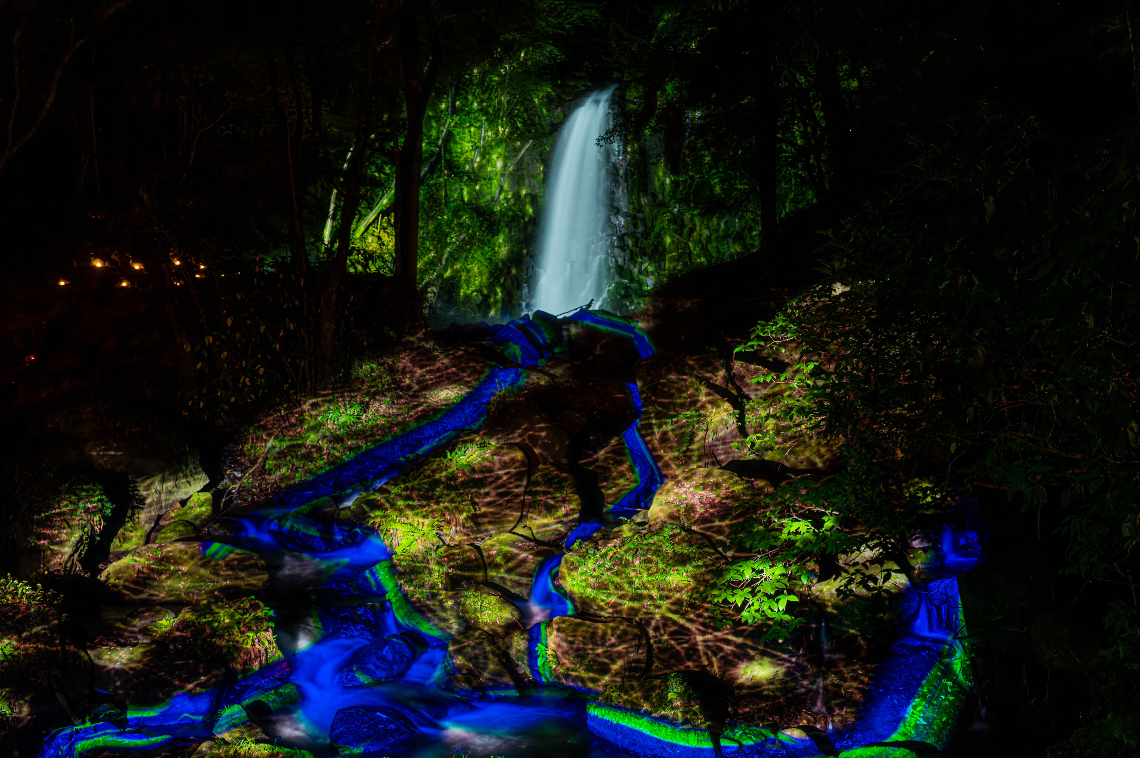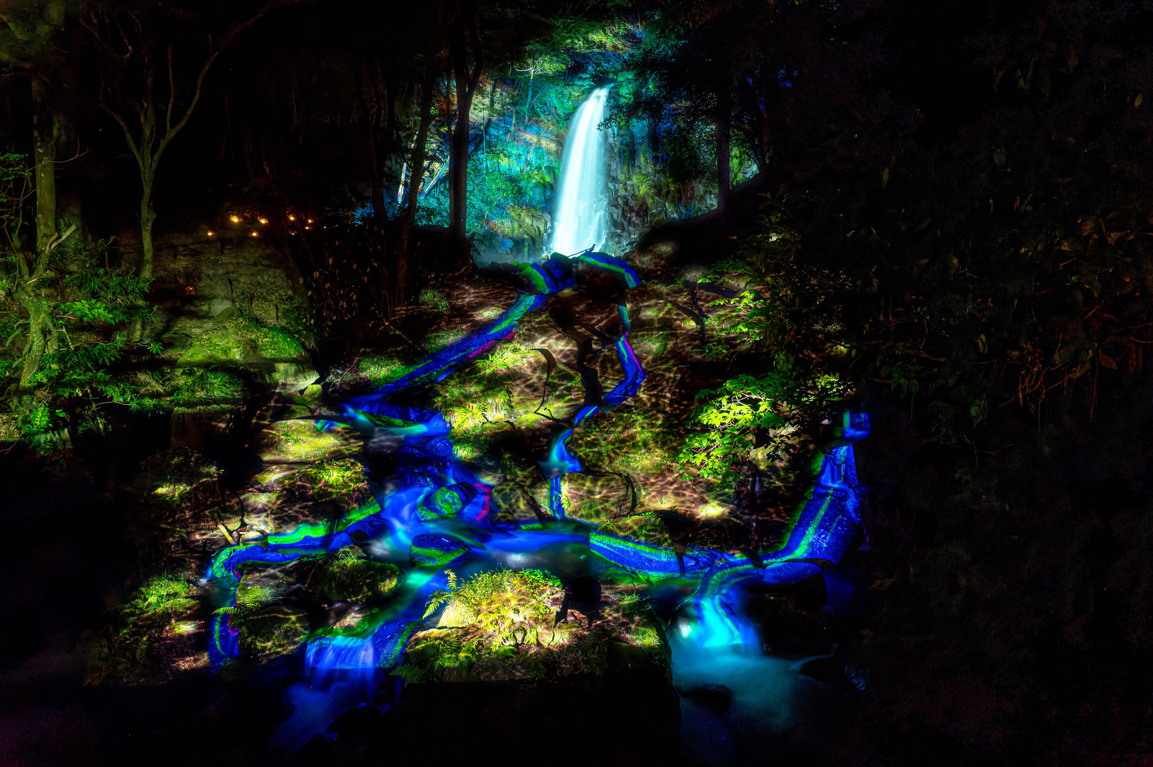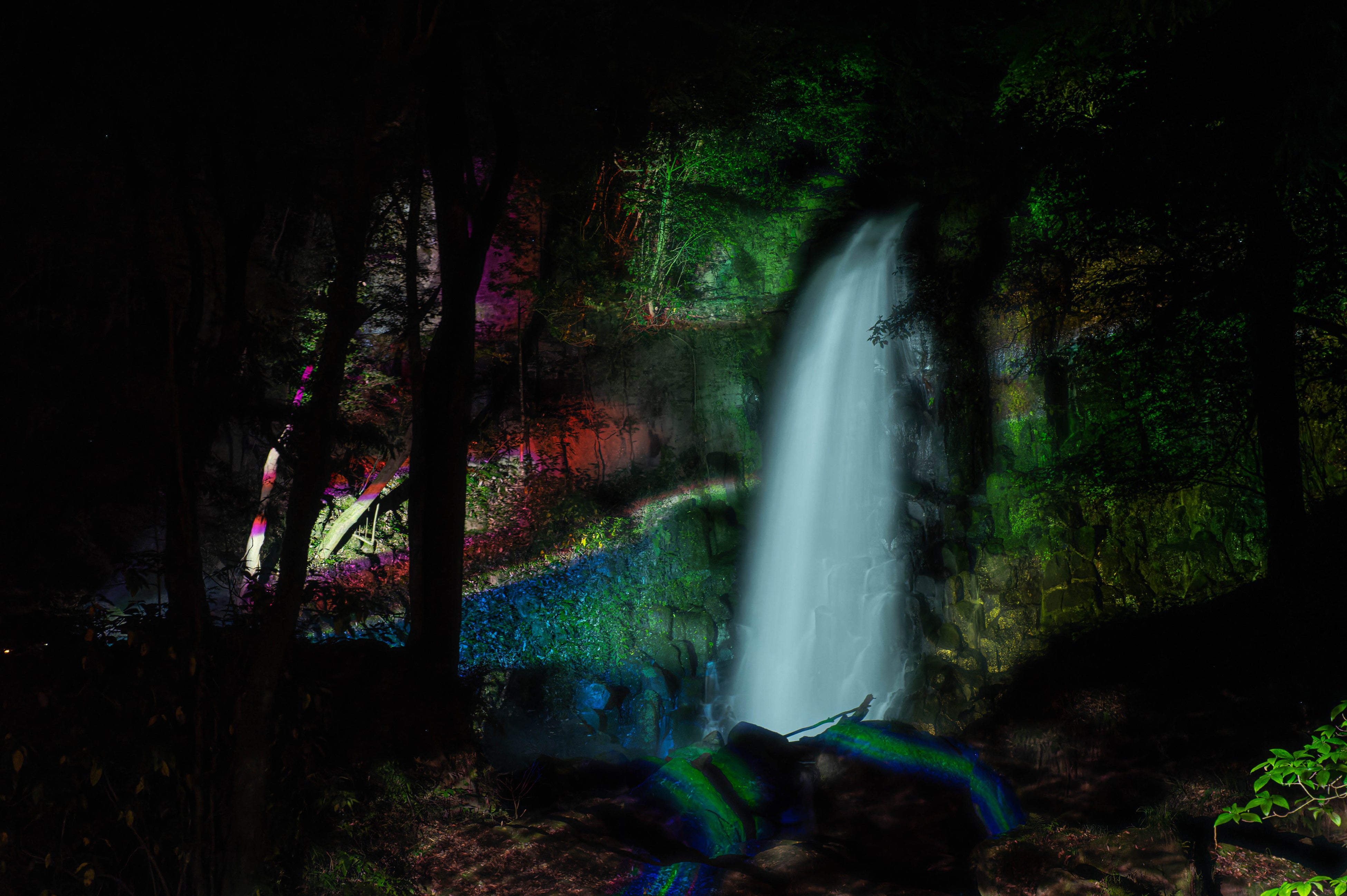 熊本県平成の名水百選に選ばれ、約20mの高さから流れ、滝の間近まで行ける白糸の滝。最近ではパワースポットとしても注目されている。この白糸の滝を含め一帯を色鮮やかにプロジェクションマッピングを実施。