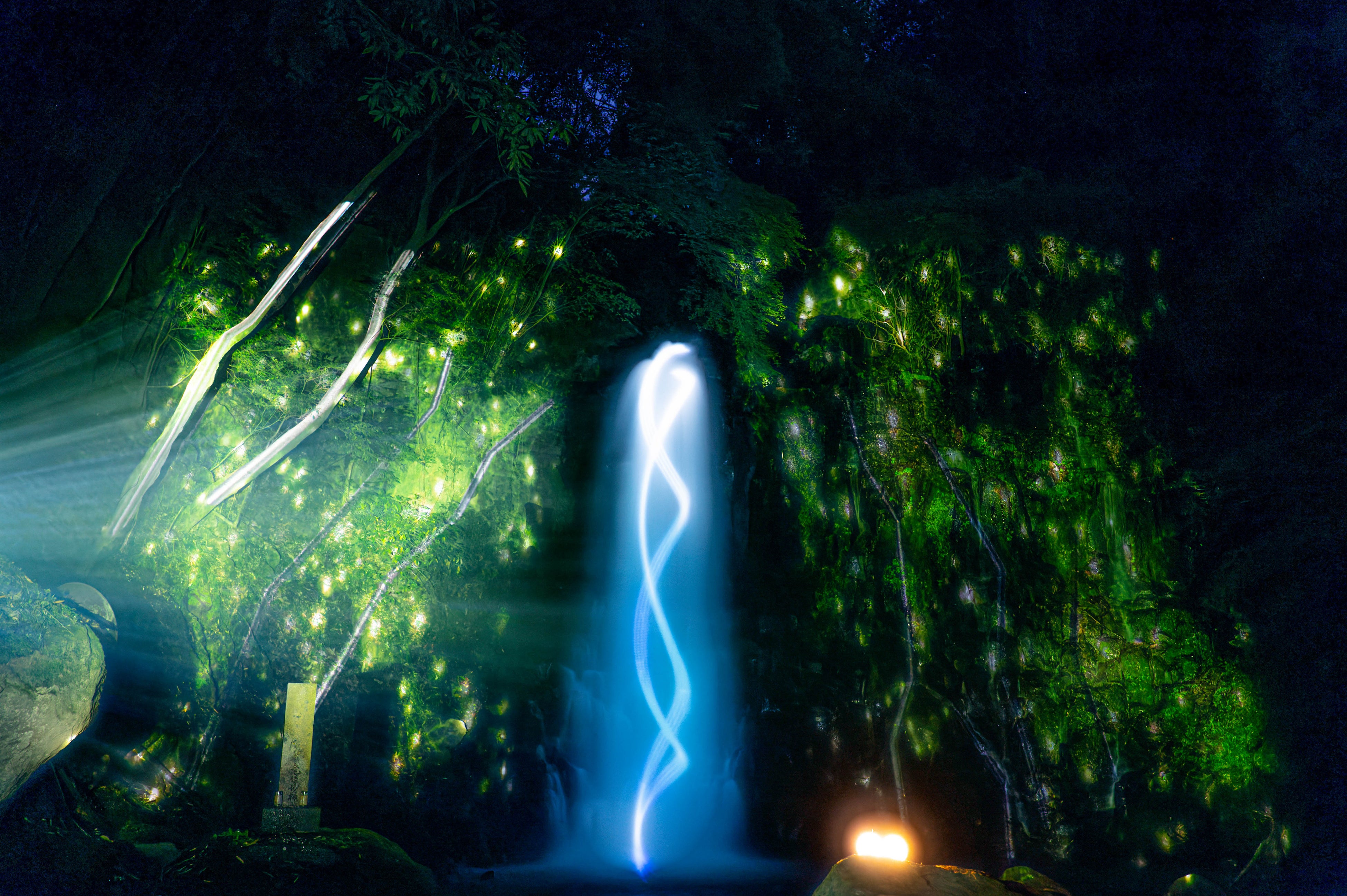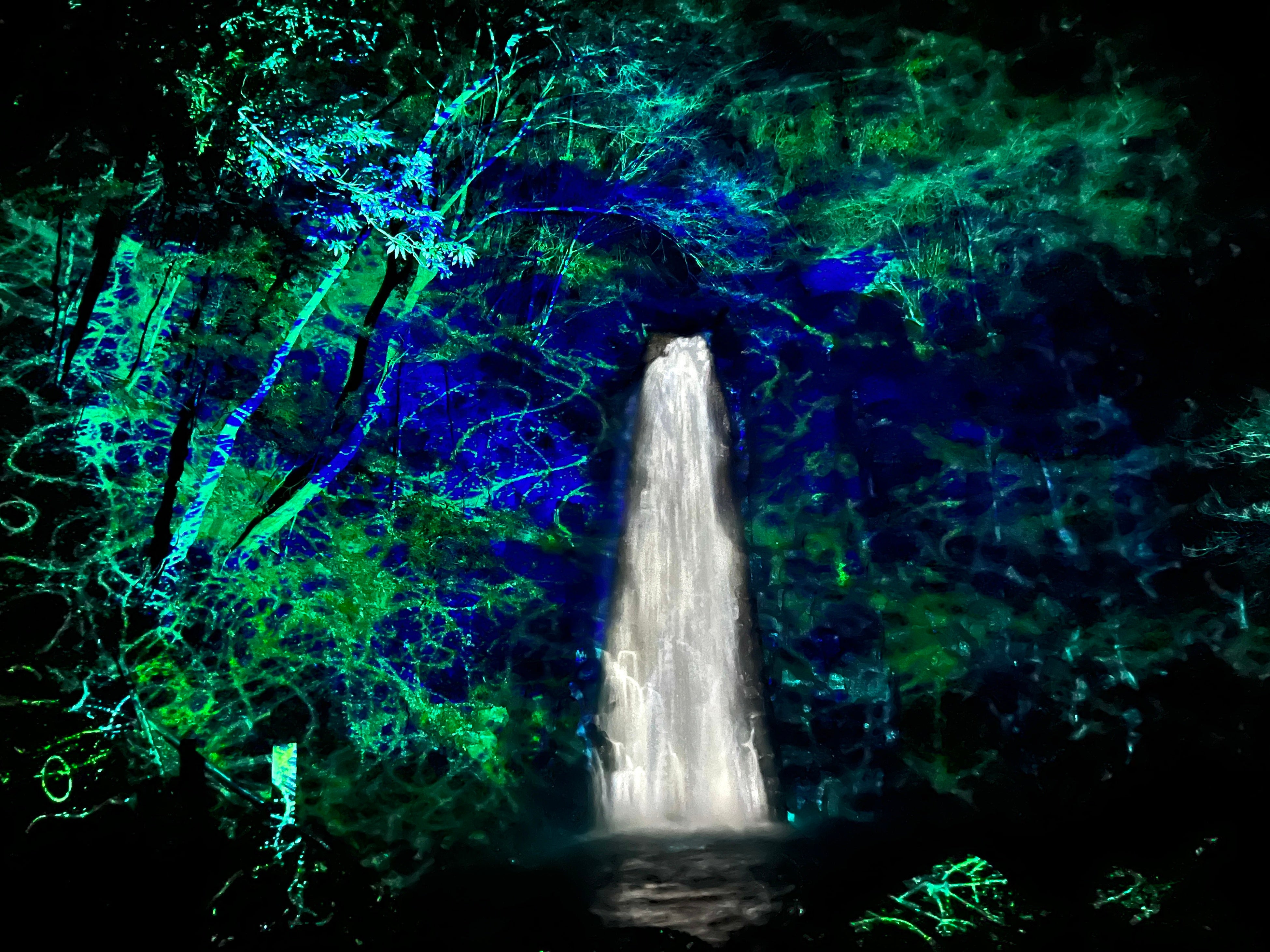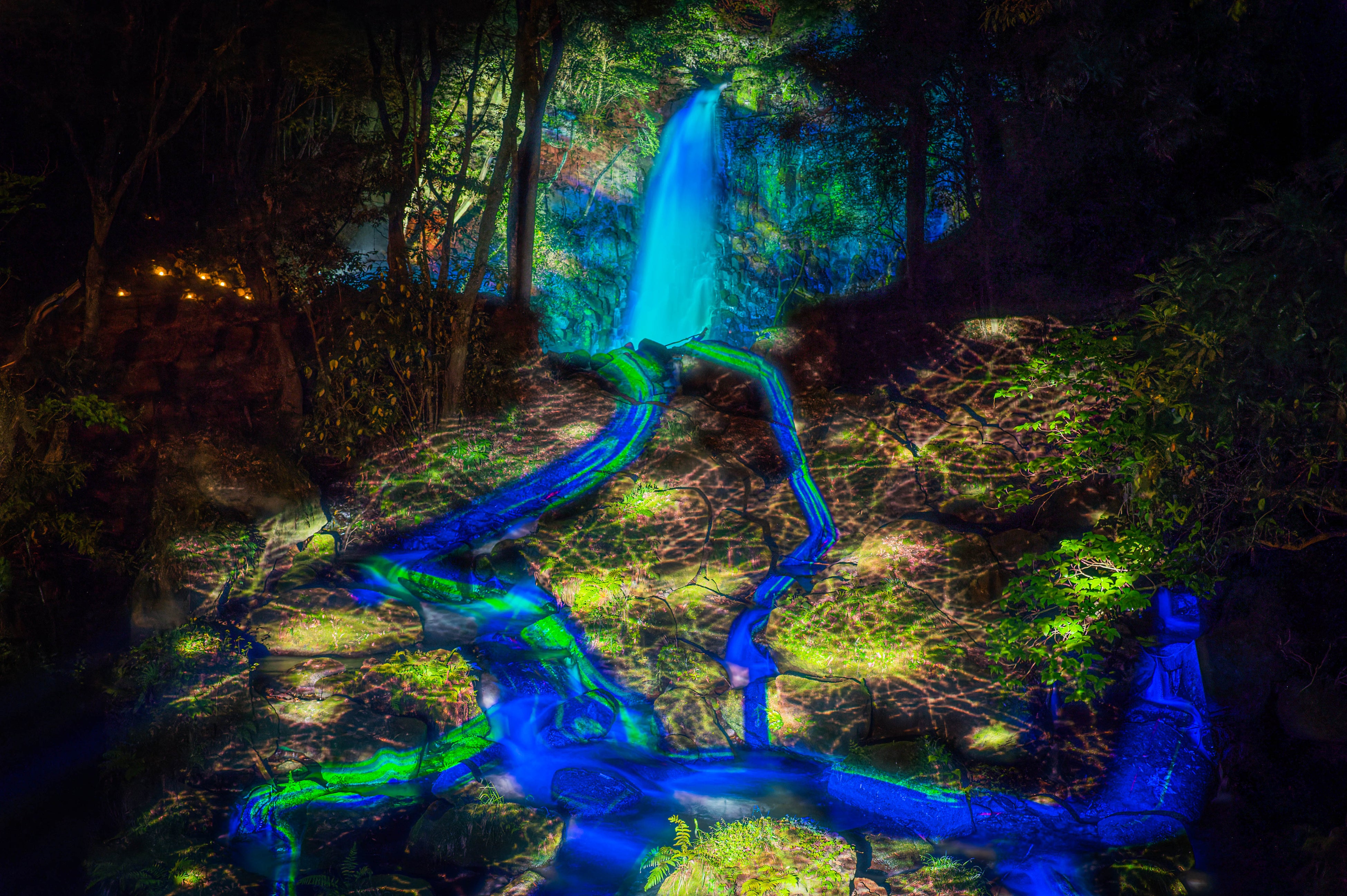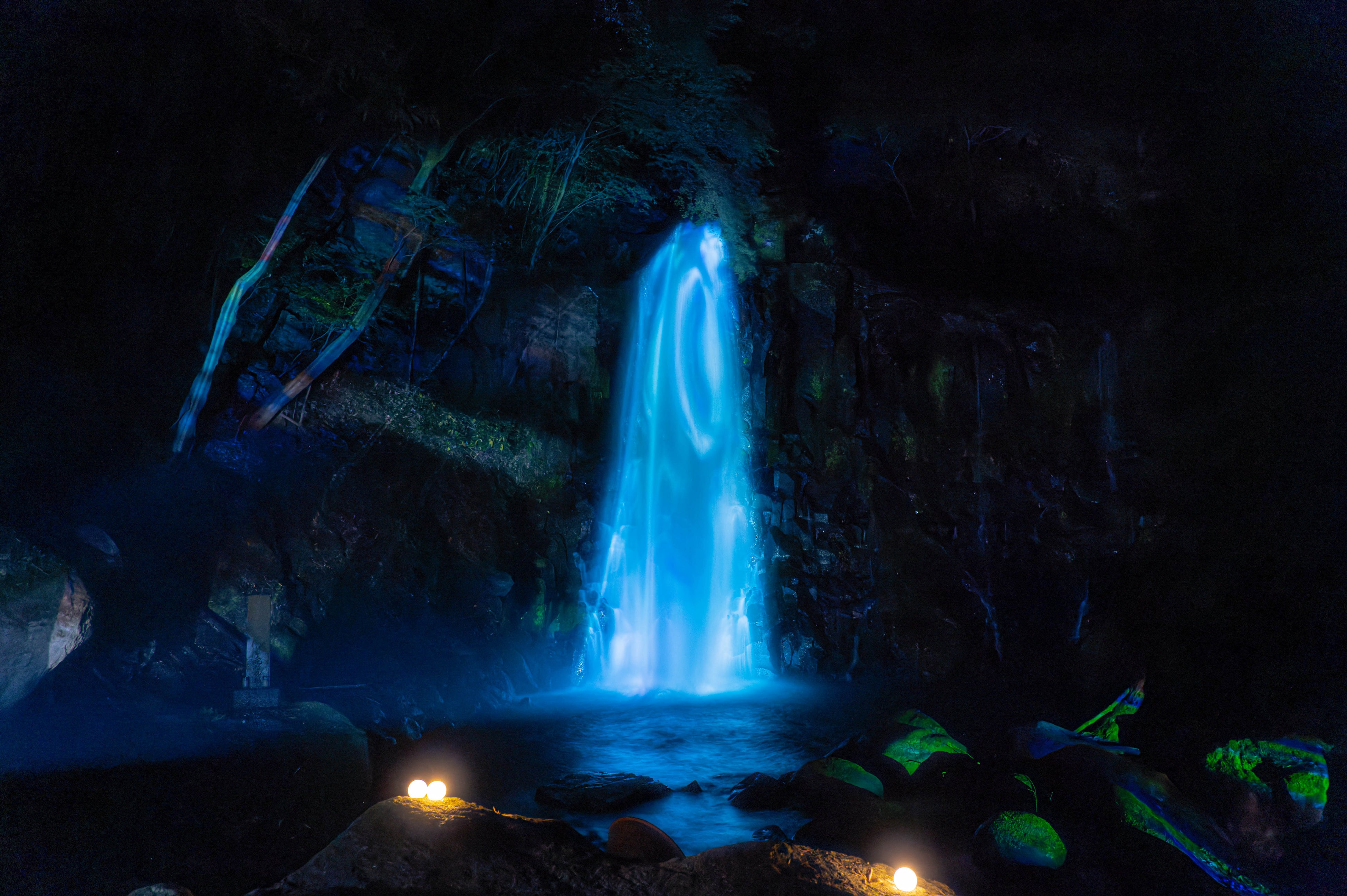 熊本県平成の名水百選に選ばれ、約20mの高さから流れ、滝の間近まで行ける白糸の滝。最近ではパワースポットとしても注目されている。この白糸の滝を含め一帯を色鮮やかにプロジェクションマッピングを実施。