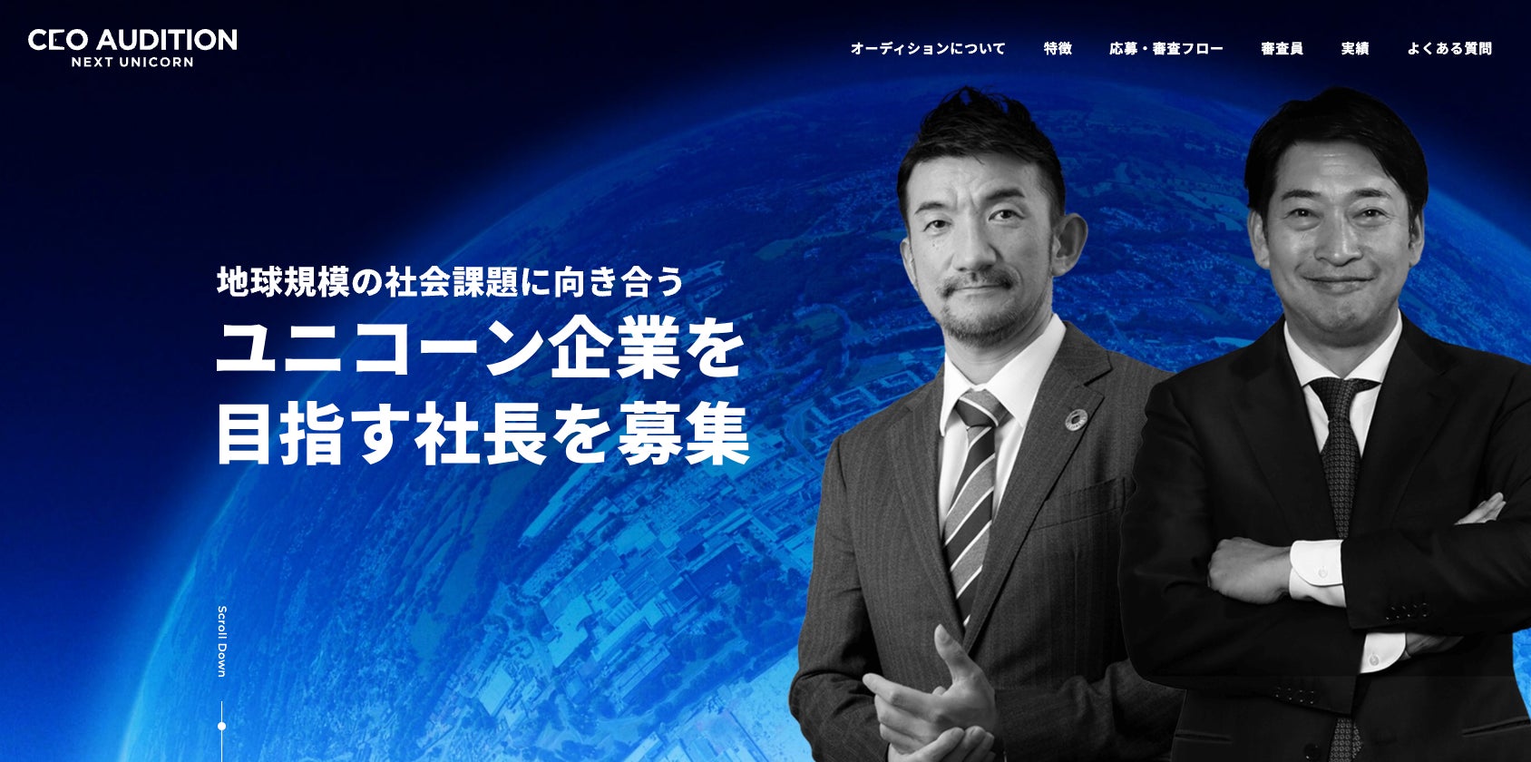 CEOオーディションは「人は誰でも社長になれる」をコンセプトに、従来のビジネスコンテストとは一線を画す「ビジネスプラン不要、年齢・経験不問」という条件で、全国各地に眠る“社長人材”を発掘するイベントです。