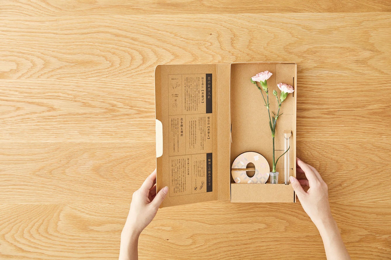 「一輪箋」は、絵葉書や手紙を送るような感覚で、花をポストから郵送できる花瓶キットです。専用パッケージにはメッセージを書けるデザインが施されており、花とともに心のこもった言葉を贈ることができます。
