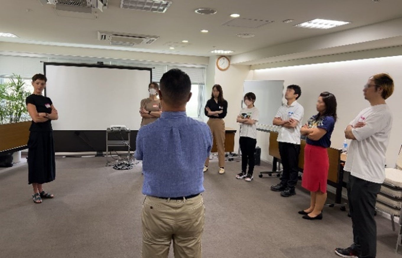 2日間の対面形式の講座では、国際コーチング連盟(ICF)PCC認定コーチでもある桜庭理奈が、社会環境が変化している現代に求められるリーダーシップやマネジメント、メンタリングやティーチングとコーチングの違いといった基礎をお話しすることから始まりました。講座では、次世代のリーダーシップとしてコーチングを日常生活で再現できるようになることを目指し、参加者が今の気持ちや沸き起こってきた感情を認識し言語化する、参加者同士の対話を通じで自身の思考や行動への理解を深めるといったアクションを繰り返し実践しました。その後、Body Storytellingの創設者であるSyv Bruzeau(シヴ・ブルゾー)氏が講師として登壇し、参加者は、身体的な感性を呼び覚ますボディ・ワークを通して、思考・心・身体の関連性に目を向けたり、意図を持った身体表現により、自己および他者への影響力を上げていく可能性についても、体験しました。