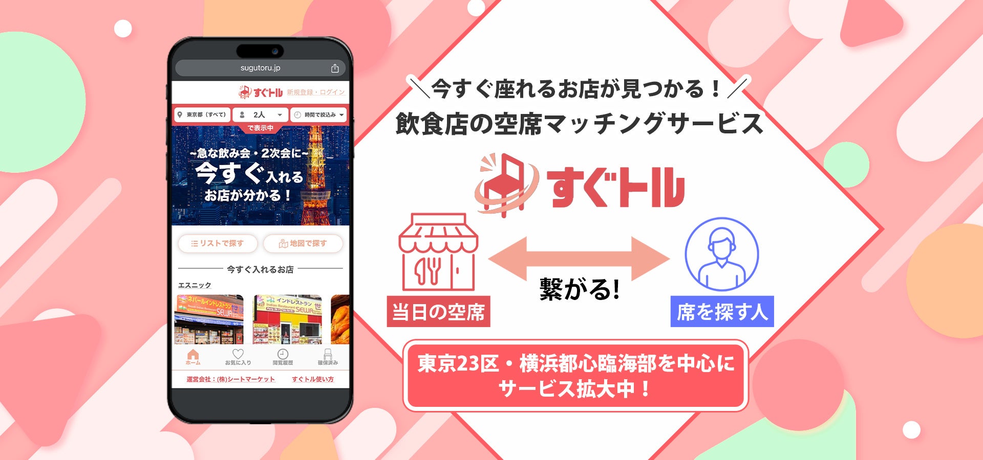 急な飲み会・お食事も簡単検索!今すぐ入れるお店情報から、5秒で空席をゲットできる当日空席予約サイト【すぐトル】