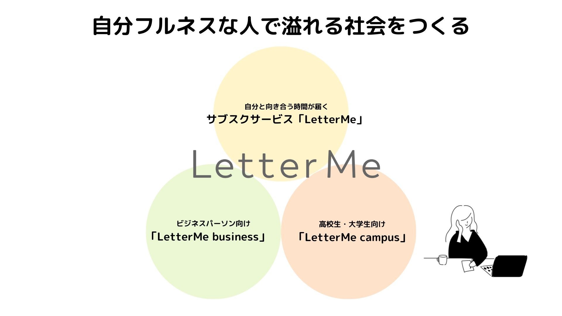 株式会社LetterMeは、自分フルネスな人で溢れる社会の実現を目指し、自分に向き合う時間が届くサブスクサービス「LetterMe」、ビジネスパーソン向け「LetterMe business」、高校生・大学生向け「LetterMe campus」を展開しています。