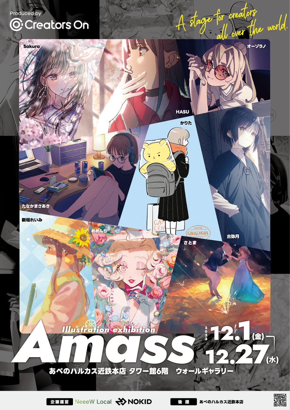 2023年12月1日(金)から、あべのハルカス近鉄本店 タワー館6階 ウオールギャラリーにてクリエイターコミュニティ「Creators On」がイラストアート展示会『Amass』を開催。