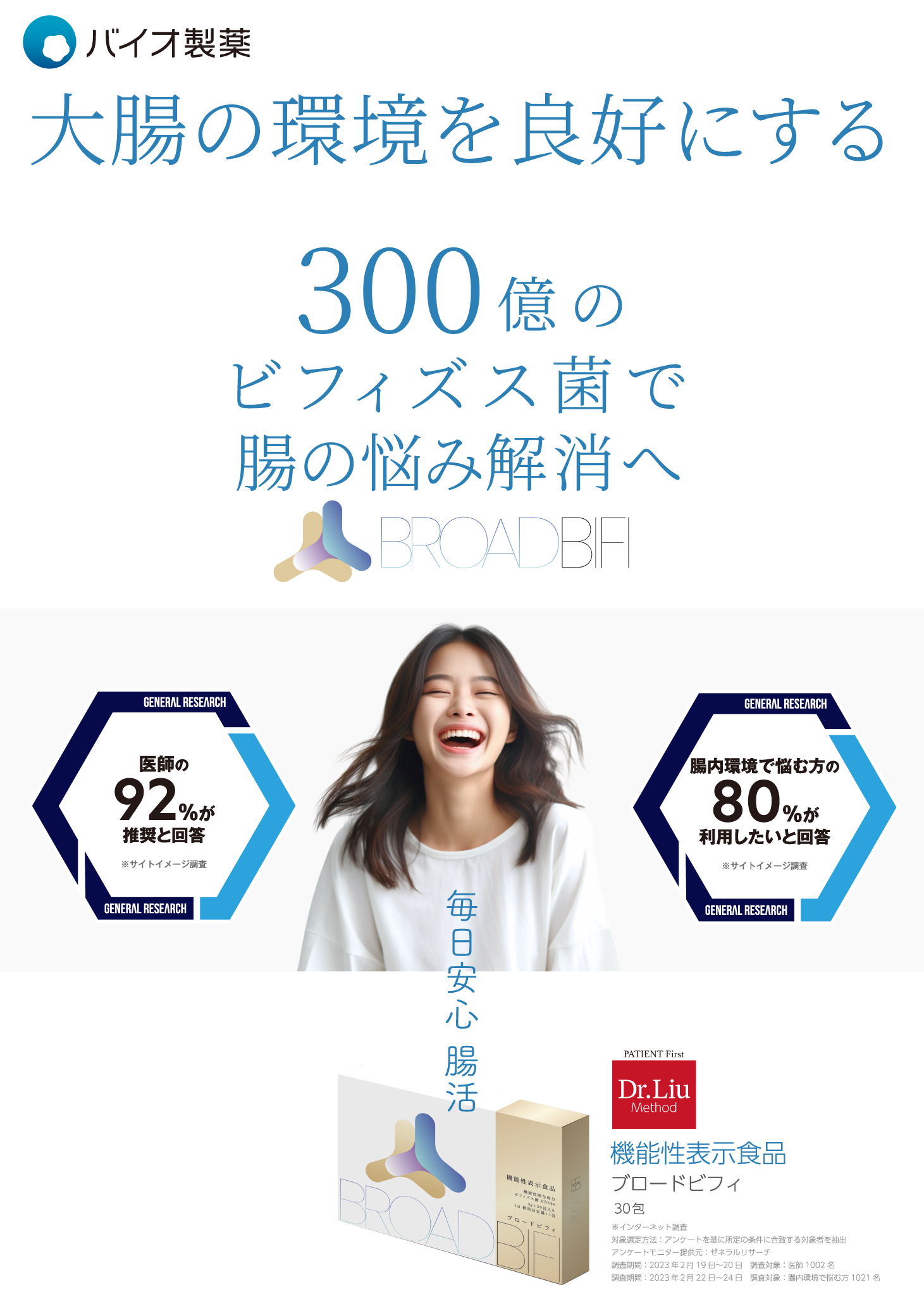 「ブロードビフィ」は医学博士監修のもと、様々なビフィズス菌を組み合わせて配合された腸活サプリメントです。