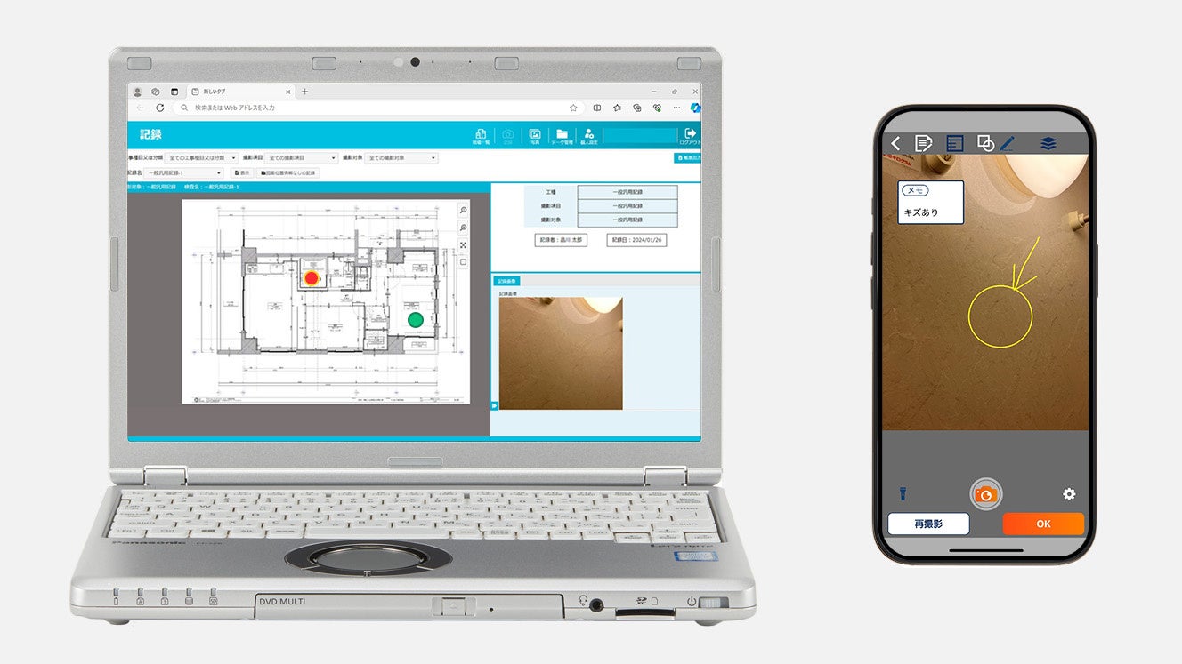 同サービスでは、パナソニックの技術を活用して開発した「CONSAIT Eye」が配筋を立体検知し、鉄筋径、本数、ピッチを計測、登録した設計データと自動照合し、帳票フォーマットを自動作成します。検査前の「検査用データ加工」、「帳票作成」は、「CONSAIT Pro配筋検査」で効率化されます。同サービスのAI&ICT技術により検査や記録の正確性、および、検査品質の向上が可能となり、同時に、配筋検査の煩雑な作業効率化、作業時間の大幅短縮を実現します。