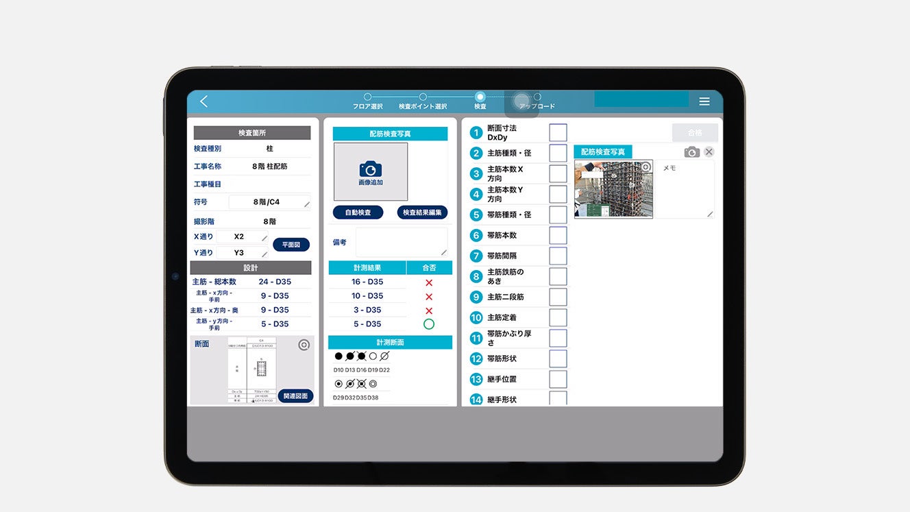 検査前の「検査用データ加工」や「検査項目の設定」、「帳票作成」といった配筋検査業務を効率化するアプリです。シンプルに使いやすくしました。