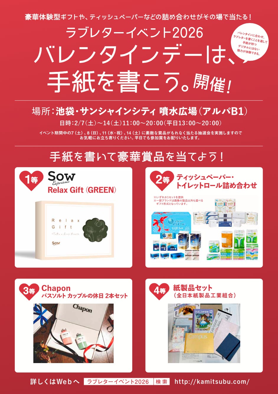 日本製紙連合会は、「片思いの相手」「恋人・夫婦」「家族」「友達」などの、大切な思いを伝えたい相手に対してのラブレターを来場者に綴っていただく、「ラブレターイベント2026 バレンタインデーは、手紙を書こう。」を、池袋・サンシャインシティ 噴水広場(アルパB1)にて2月7日(土)~2月14日(土)まで開催します。