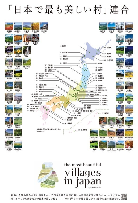 「日本で最も美しい村」連合は、「美しい村を、美しいままに。」をキャッチフレーズに、全国61の地方自治体・地域と、66社の企業サポーター(正会員)、230の個人・企業・団体(準会員)で構成されるNPO法人です。(2022年6月現在)
