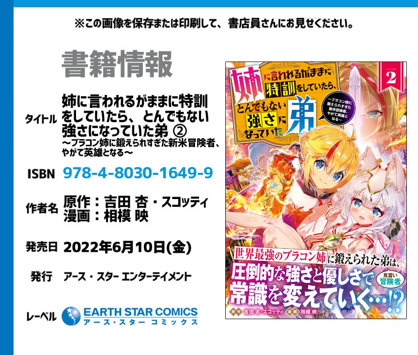 アース・スターノベルで刊行中の人気ノベル作品が原作で、現在コミック アース・スターで掲載している人気作品『姉に言われるがままに特訓をしていたら、とんでもない強さになっていた弟 ~ブラコン姉に鍛えられすぎた新米冒険者、やがて英雄となる~』コミックス第2巻を6月10日(金)に発売いたします。