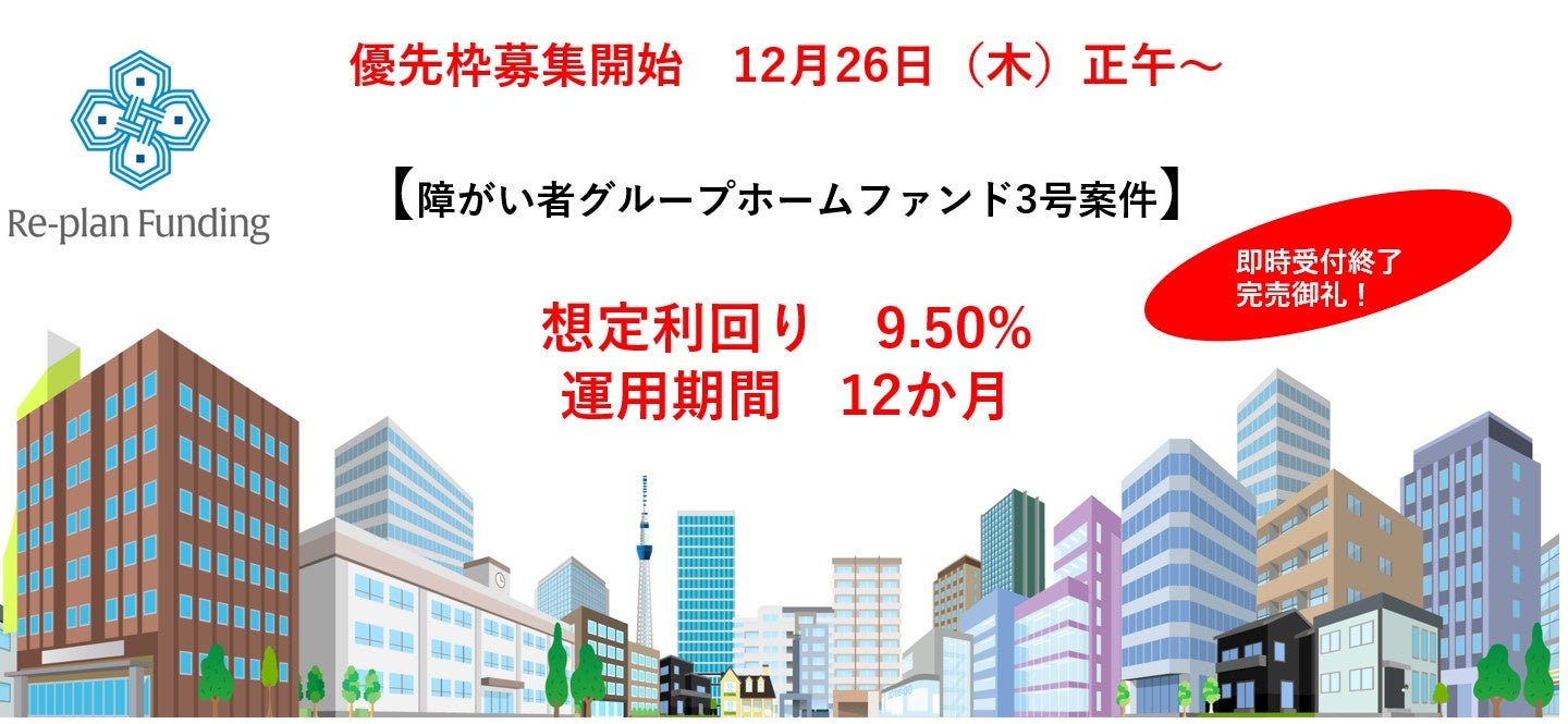 株式会社リプラン(本社:神奈川県横浜市港北区、代表取締役:三浦 洋平)は、不動産投資型クラウドファンディングサービス「Re-plan Funding」において、2024年12月26日より「インカム型 第3号グループホームファンド」の優待枠の申込受付開始し、直後に申込受付終了になりました。