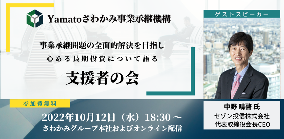 株式会社Yamatoさわかみ事業承継機構(本社:東京都千代田区、代表取締役:吉川 明)は、中小企業の事業承継問題の全面的解決を目指し、個人投資家の方が「社会貢献しながら資産運用する」ソーシャル運用® の機会を提供すべく「事業承継未来ファンド 2022-3(第5号)」の募集を開始し、本年12月12日まで申し込みを受け付けます。本ファンドの詳細については下記より資料請求をお願いします。