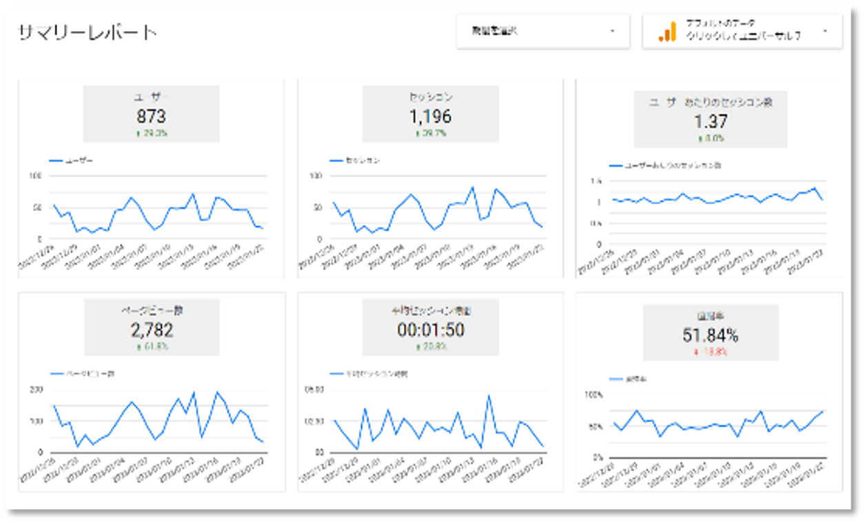 - 定量的分析レポートをご希望の場合は、ユーザー数やページビュー等の基本的な項目を計測し、Webサイトのアクセス状況を可視化できます。