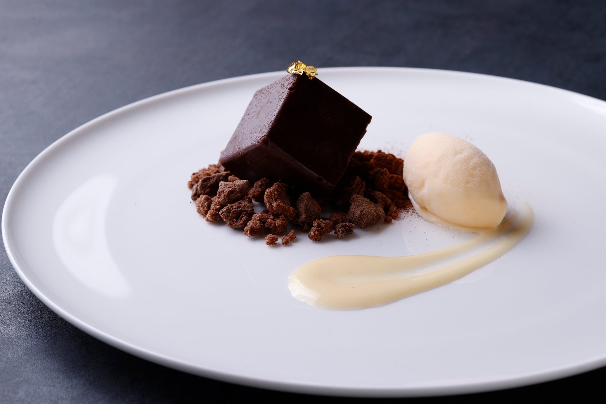 カカオバリー社の上質なショコラを使ったキューブ型のテリーヌの中にカシスのマルムラードを忍ばせ、大人っぽい酸味がショコラの味わいを引き立てます。コーヒーのクランブル、バニラアイスクリーム、カスタードのソースとともにお楽しみください。