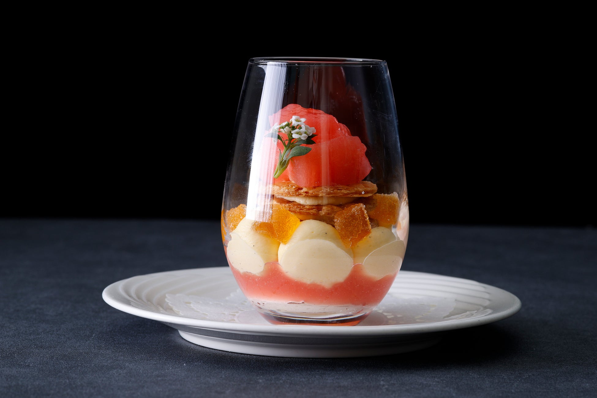 アップルパイをグラスデザートとして再構築した一品。あんずのパートドフリュイ、ディプロマットクリーム、中心にメレンゲとドライフルーツ、生クリームのムース、パイ生地、りんごのジャムとコンポートで仕上げています。