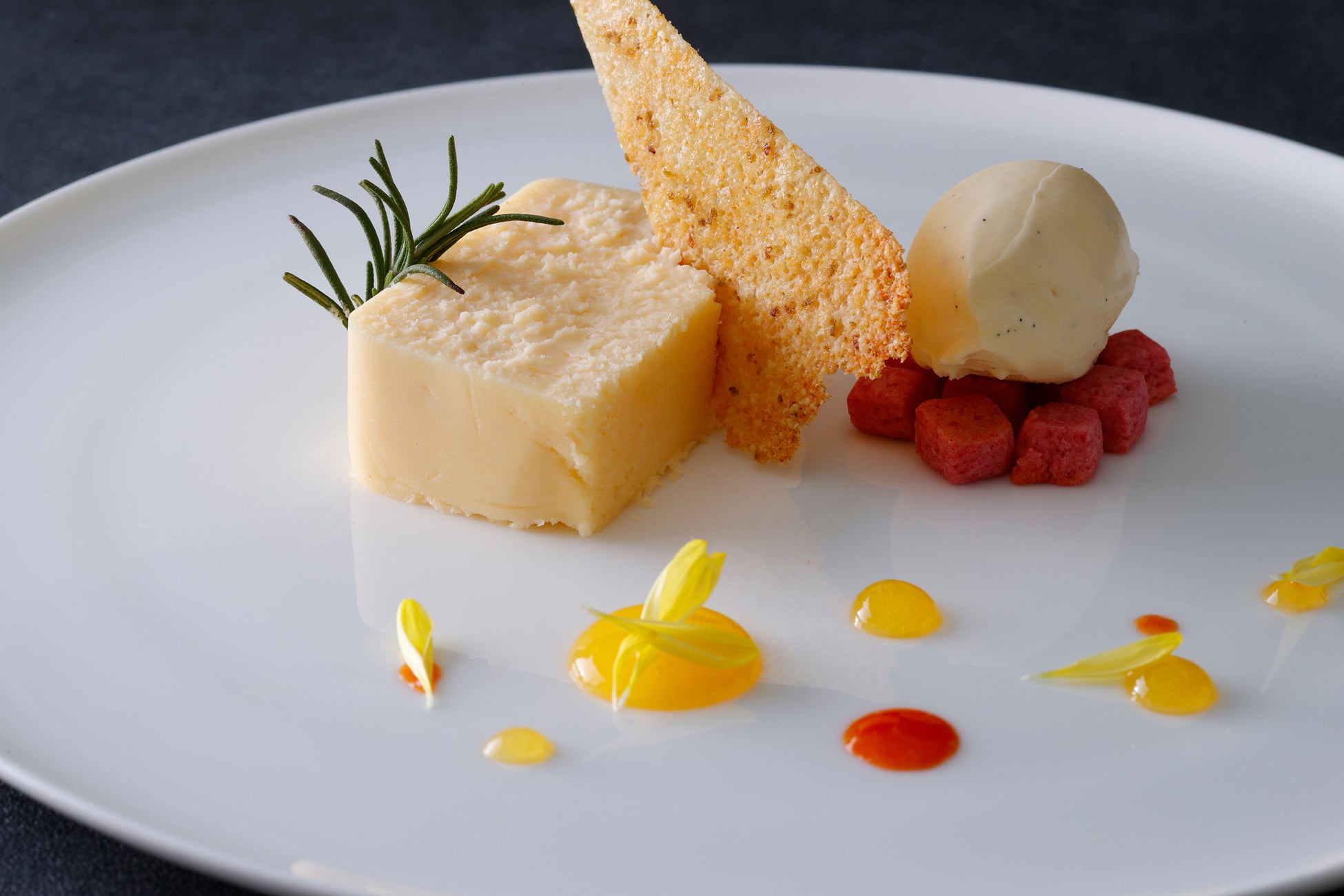 テリーヌ型でしっとりとした食感に仕上げた濃厚なチーズケーキに、ビーツのクッキー、バニラアイスクリームを添えました。マンダリンオレンジとブラッドオレンジの2種のソースがアクセントになっています。