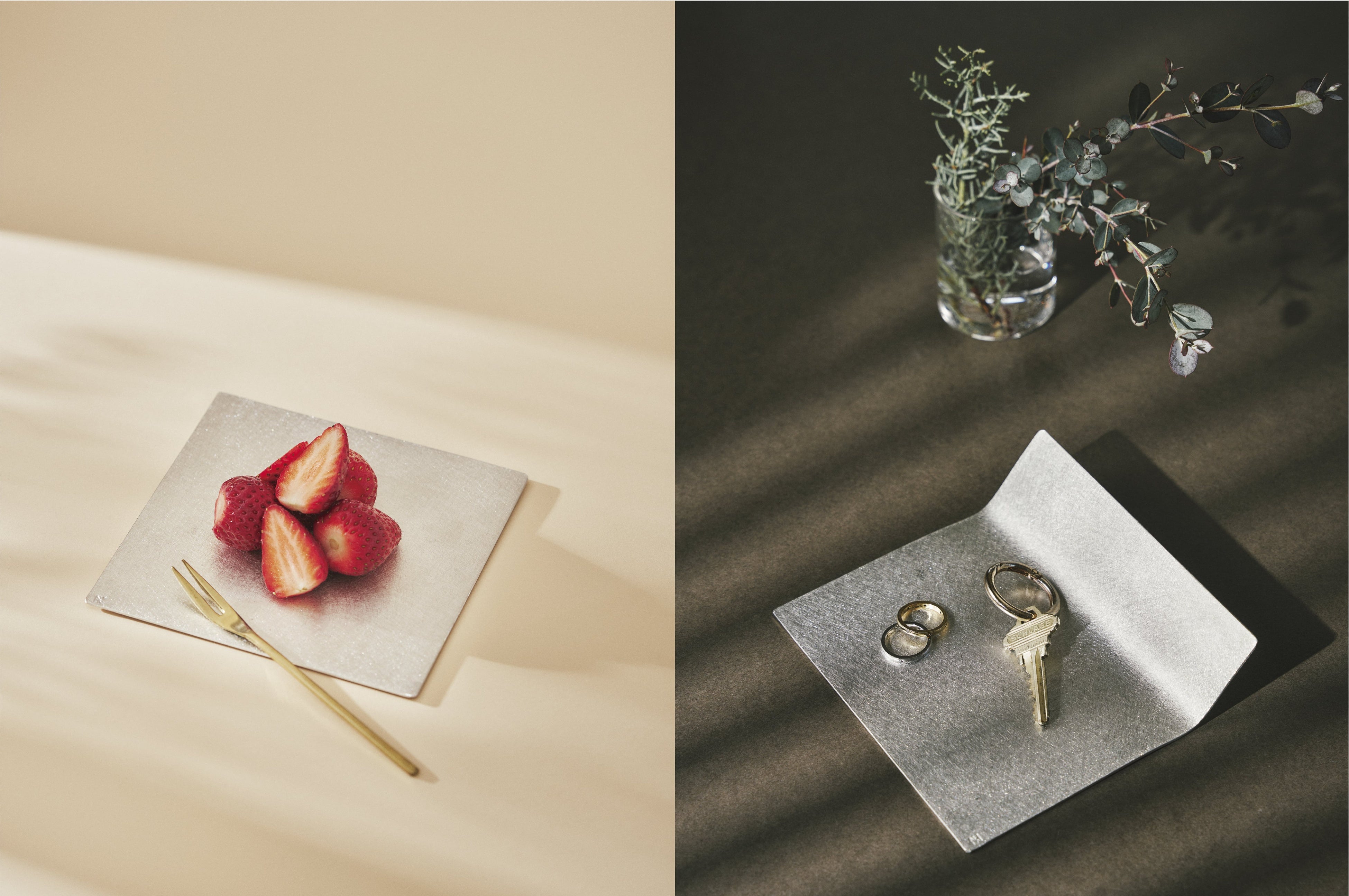 錫は、古くから飲食器として使用されてきました。食品や小物をのせて、いろいろな用途にお使いいただけます。素材には金属なのに手で簡単に曲げ伸ばしができる高純度の錫を用いています。使いやすいサイズをご用意しました。金属なのに柔らかく曲げる事ができ、自分なりのアレンジができるので生活スタイルに合わせてお使いいただけます。