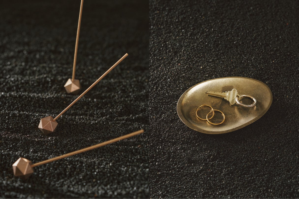 ブロンズ製のお香立て・DLCコーティングを施したリラクセーションツール・錫の曲がるプレート・真鍮のマルチトレイを発売