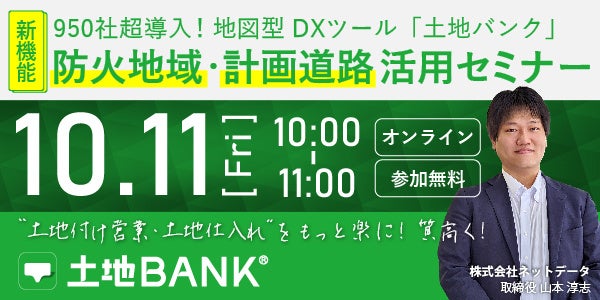 また、今回のアップデートを記念し、当社は10月11日(金)に、防火地域・計画道路活用セミナーを開催いたします。当セミナーではデモ画面を使った防火地域・計画道路機能の操作方法、商談での具体的な活用方法についてお伝えします。