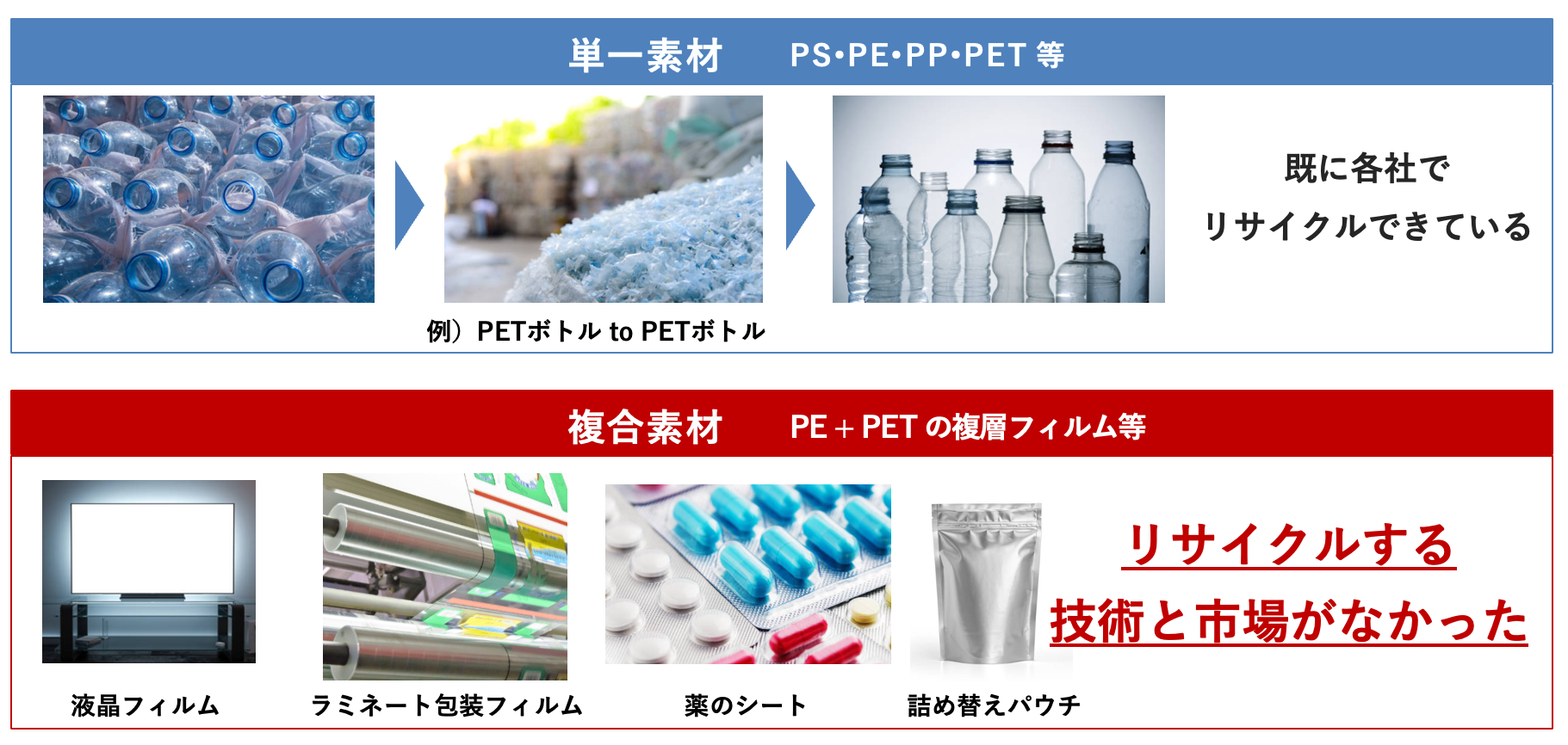 一般に使用されているプラスチックの多くは、多層プラスチックフィルムに代表されるように、機能・性能を持たせるために性質が異なる複数種類のプラスチックを複合して使用されています。しかし、複数種類が複合されたプラスチックのマテリアルリサイクル (廃プラスチックをそのまま原料にして、破砕・溶融などの処理を行った後に再生利用するリサイクル方法) 手法は確立されておらず、既存技術では再生原料として使用されることはほぼありません。