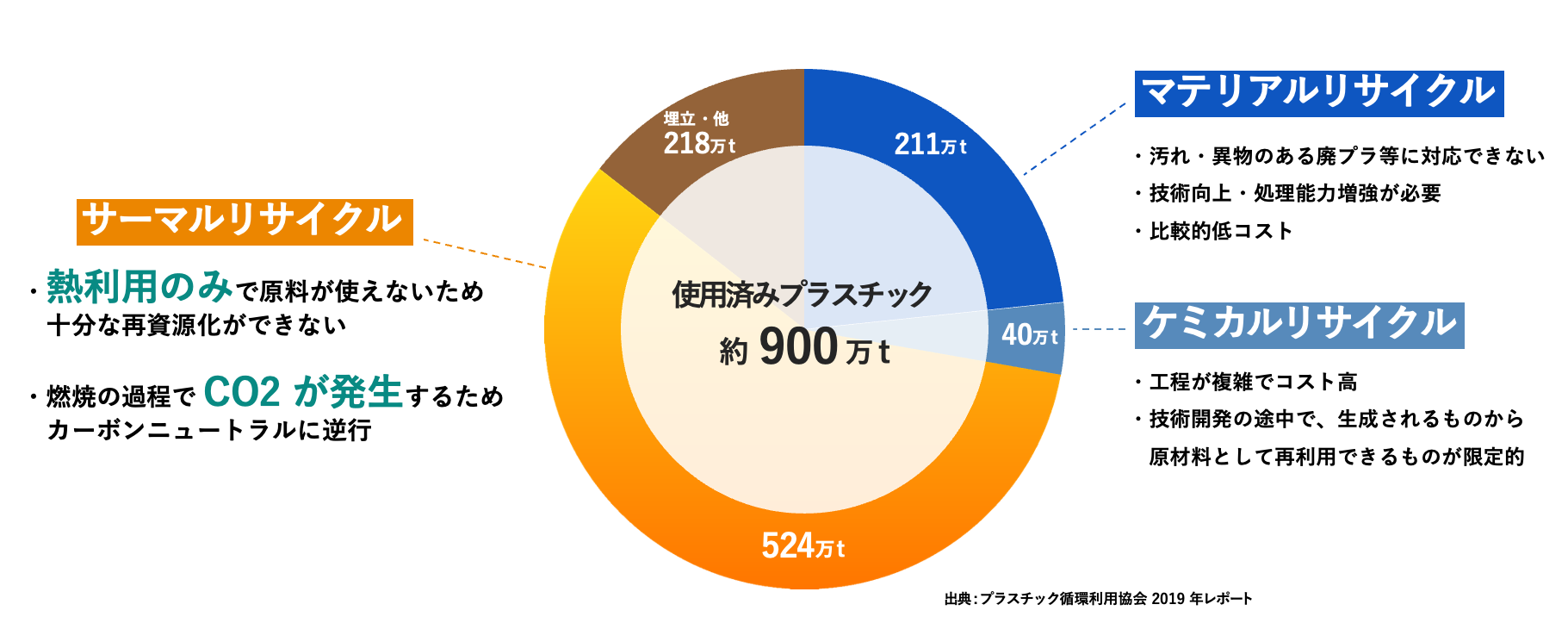 日本国内におけるプラスチックは、品質や技術的な観点から、リサイクルして生まれ変わるのは25%に過ぎず、約60%が焼却されています。そして、熱回収すらできない15%は、埋め立てや他国での処理が当たり前でした。これらの課題を解決しないことには企業のサプライチェーン全体における脱炭素社会・ESG経営の実現は進んでいきません。
