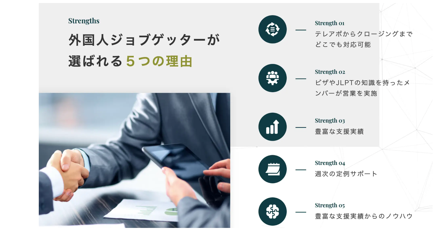 外国人ジョブゲッターは、アポイント取得から求人票獲得までを一貫して行っております。また、豊富な支援実績と既に知見のあるメンバーによる稼働が行える点が特徴です。