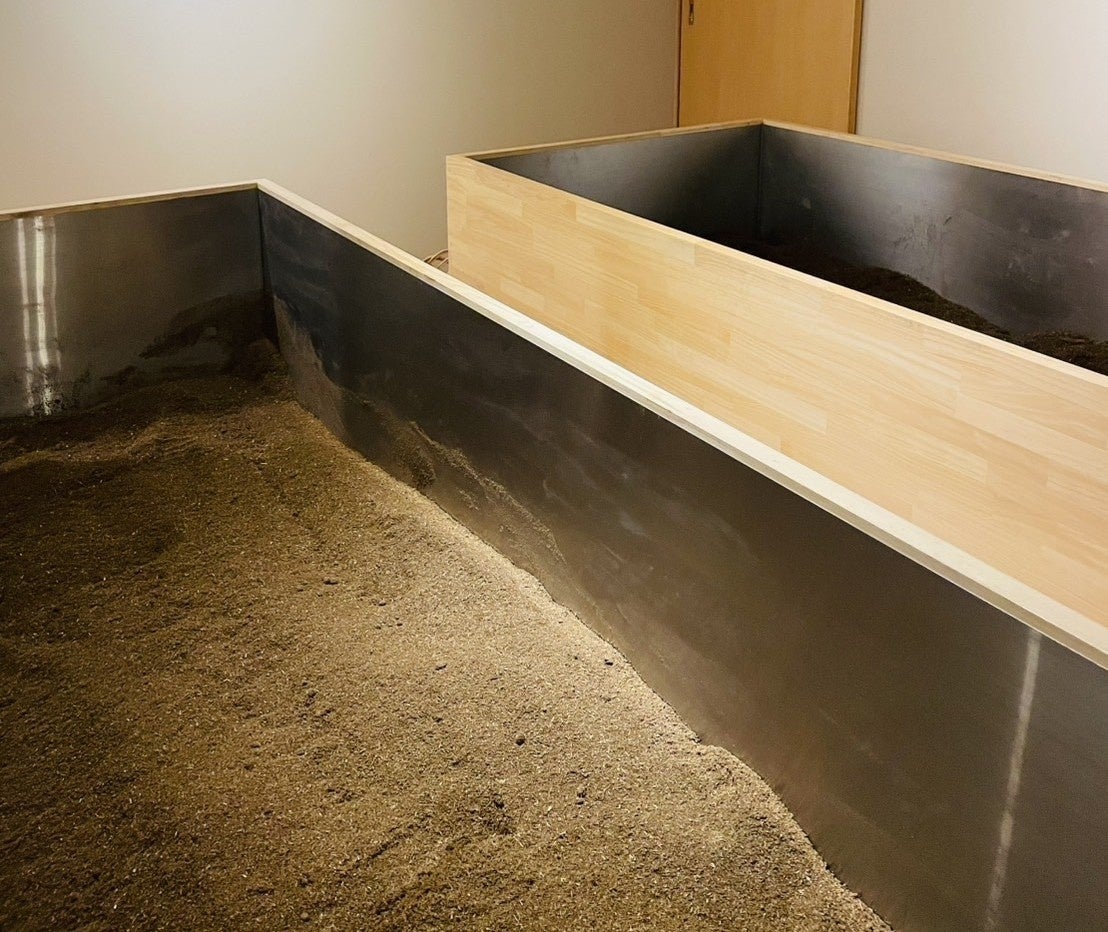 酵素浴槽に仰向けで横になり、米ぬかで全身を覆います。10-15分ほど入浴いただきます。