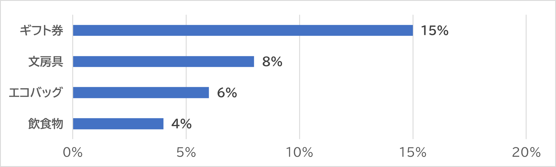 今後欲しいと思うノベルティを質問したところ、「ギフト券」が15%と回答がありました。ギフト券の中でも「Amazonギフト券」が欲しいという回答が多く、買い物もネットショッピングが主流となっていることがわかります。次いで、ボールペンやメモ帳などの「文房具」が8%、実用性のある「エコバッグ」が6%という結果になりました。